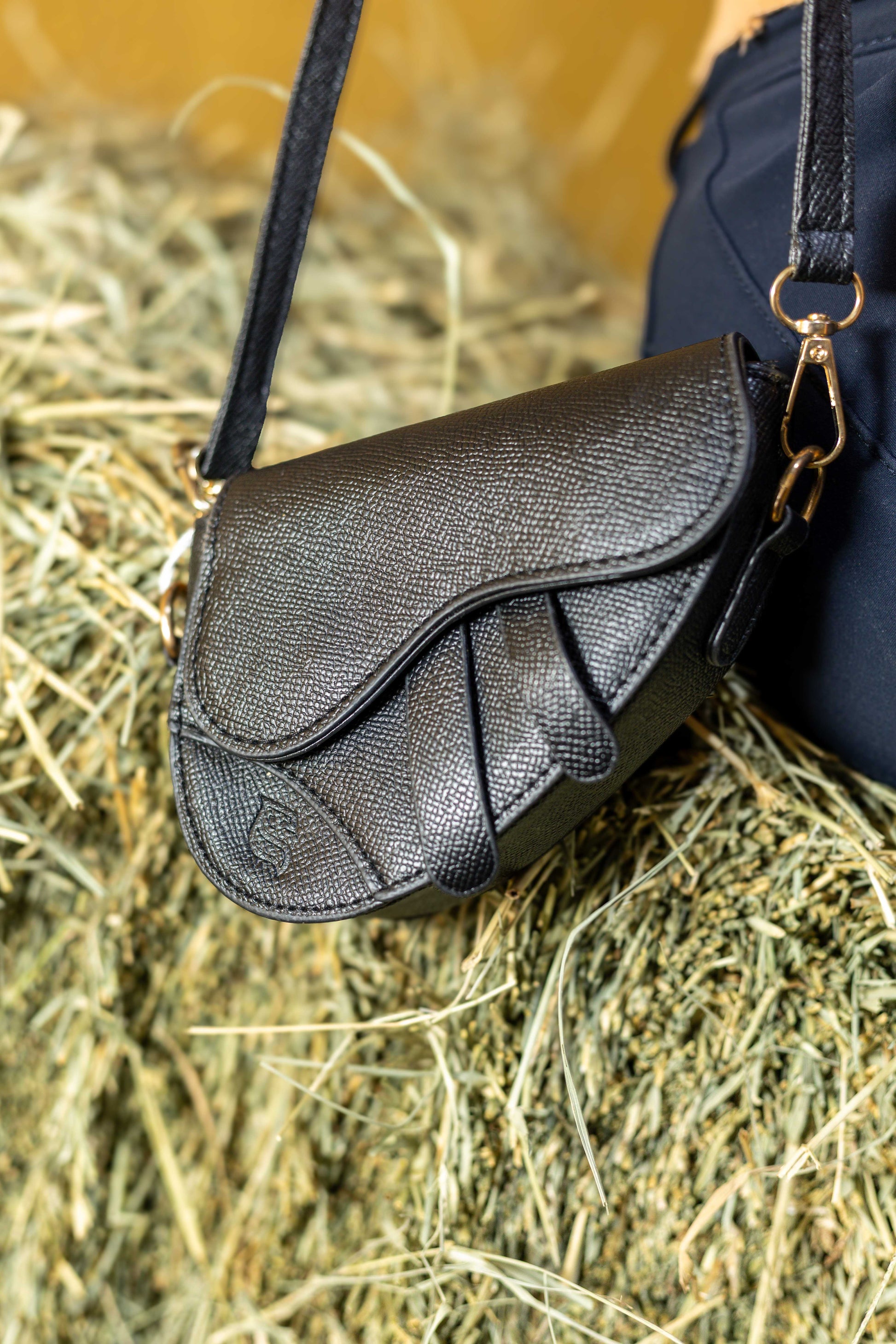 Bolsa de sela em couro sintético com fechamento em zíper e botão. Acompanha duas alças removíveis: uma curta e outra larga para uso transversal.