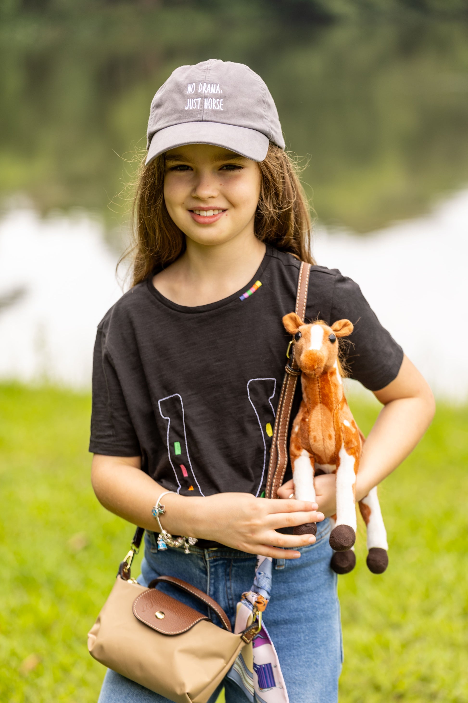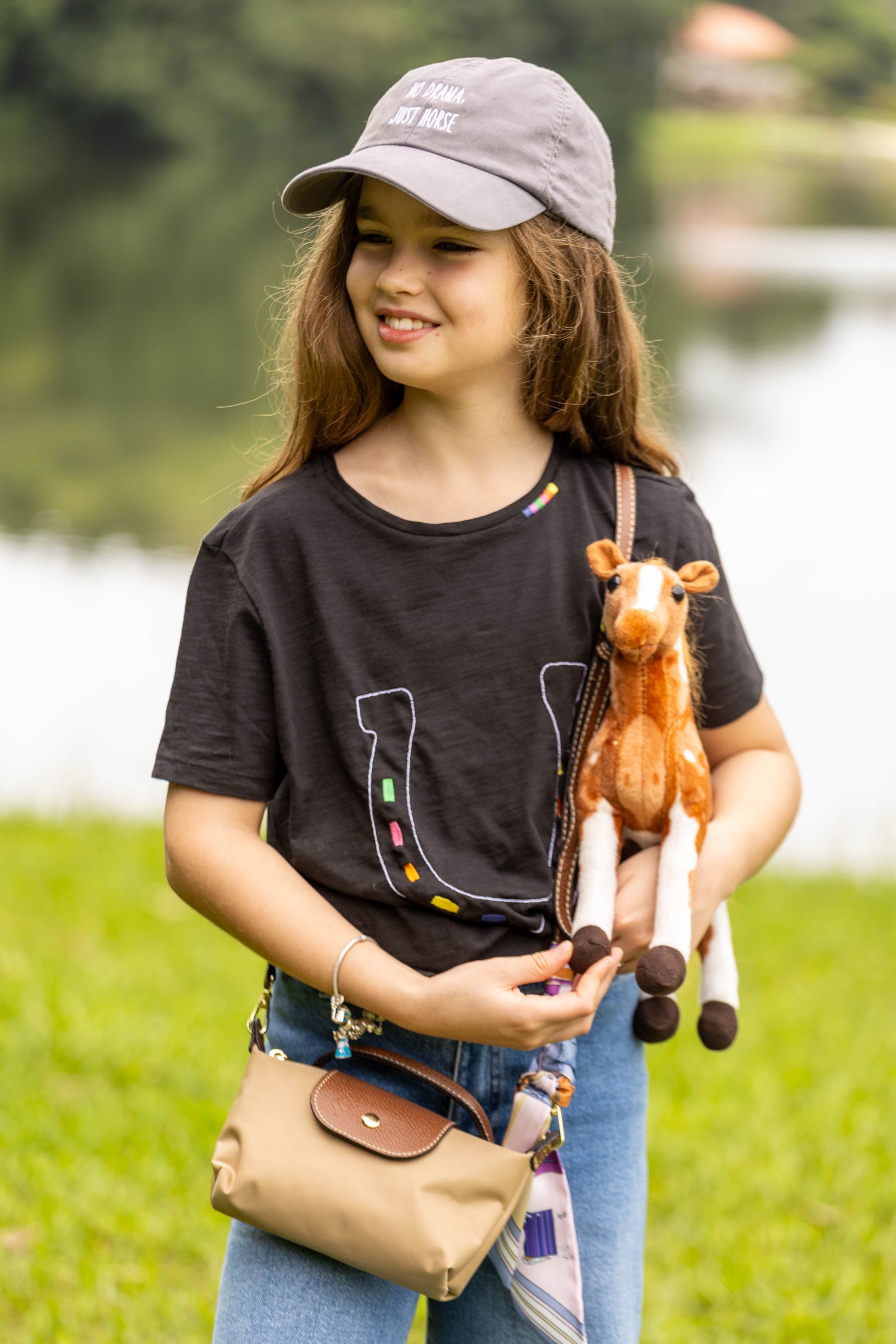 Estilo despojado e mensagem direta para os amantes do cavalo. Disponível nas cores cinza e laranja, com ajuste traseiro para conforto personalizado.