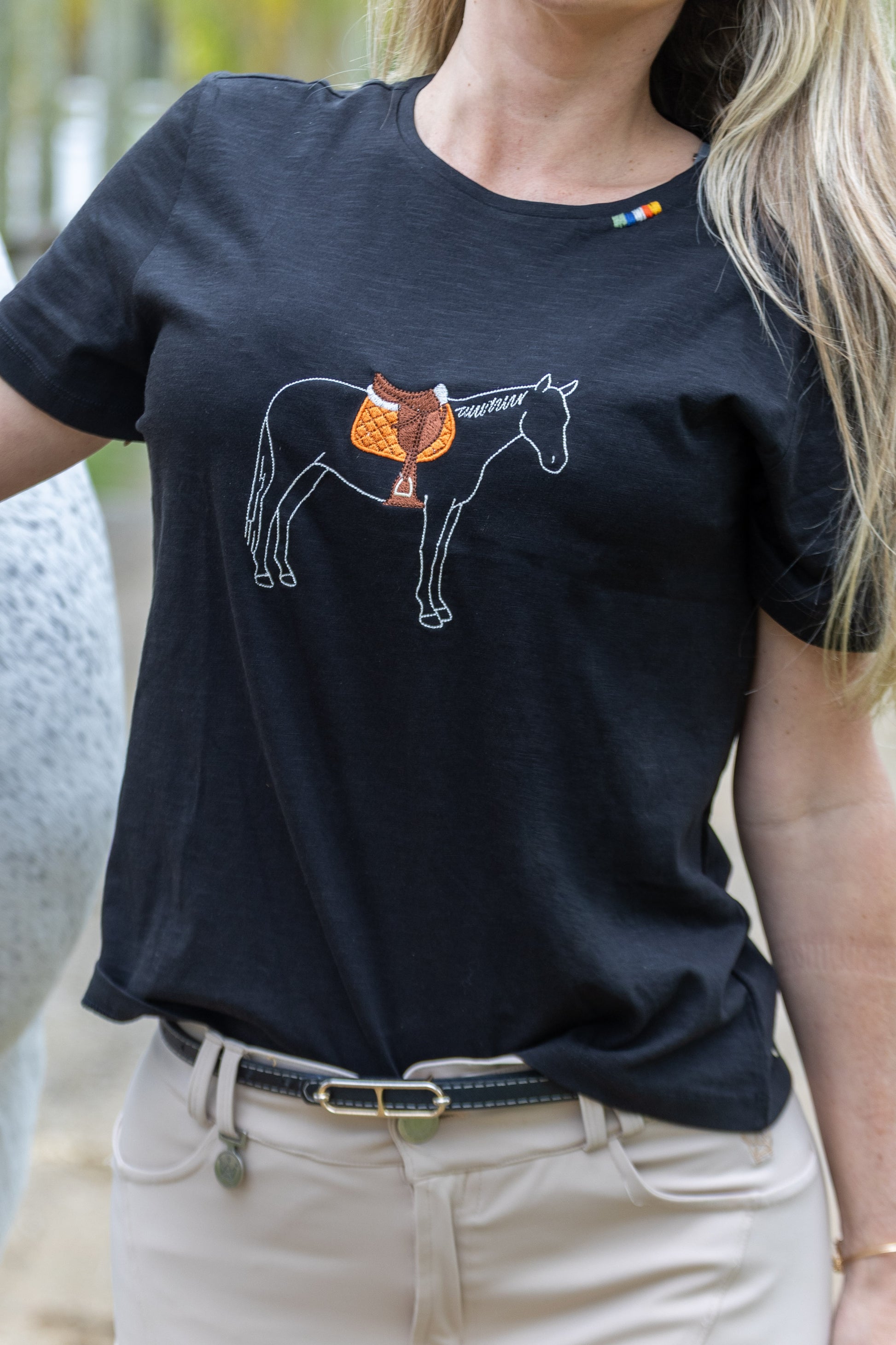 Elegância e paixão equestre em uma peça só! Essa camiseta preta traz um lindo desenho de cavalo selado , com detalhes vibrantes na sela que destacam a arte.