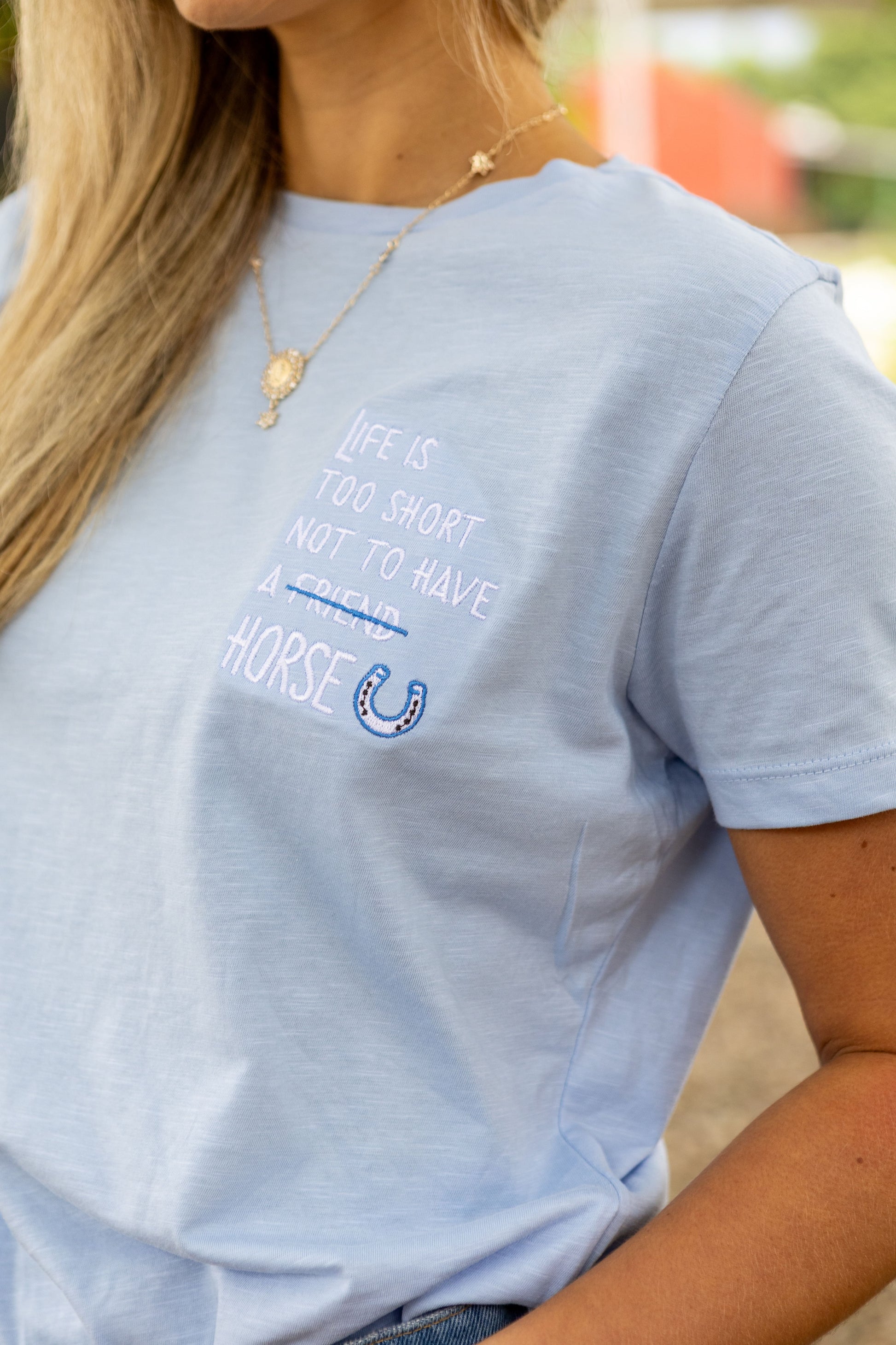 Da coleção exclusiva da Bel Tonello, a camiseta azul marinho une elegância e identidade. Na frente, a frase “Dozent Top” bordada com destaque; nas costas, uma ferradura em strass que adiciona brilho e personalidade. Feita em algodão peruano 100% com malha flamê, confortável e cheia de estil