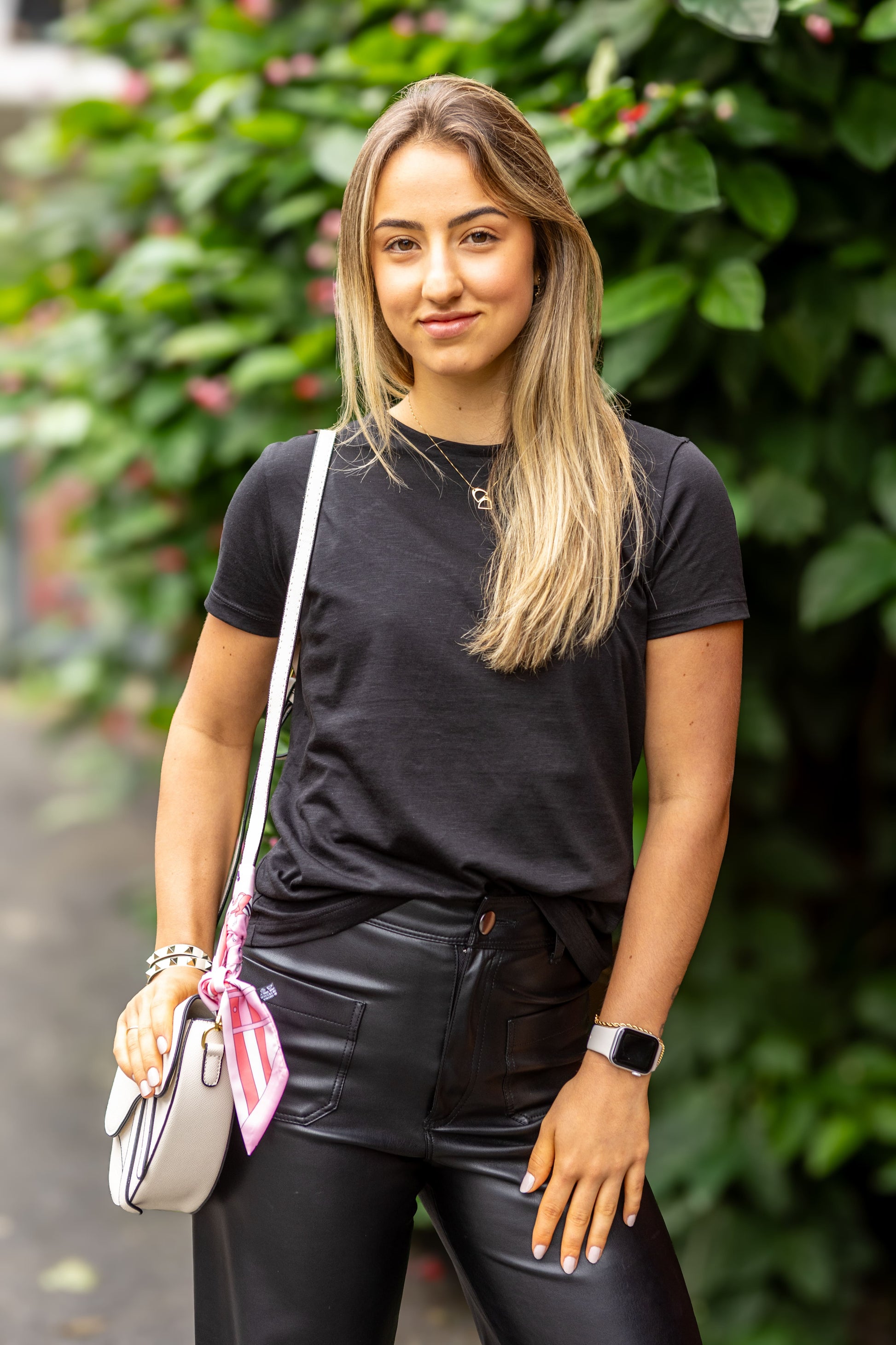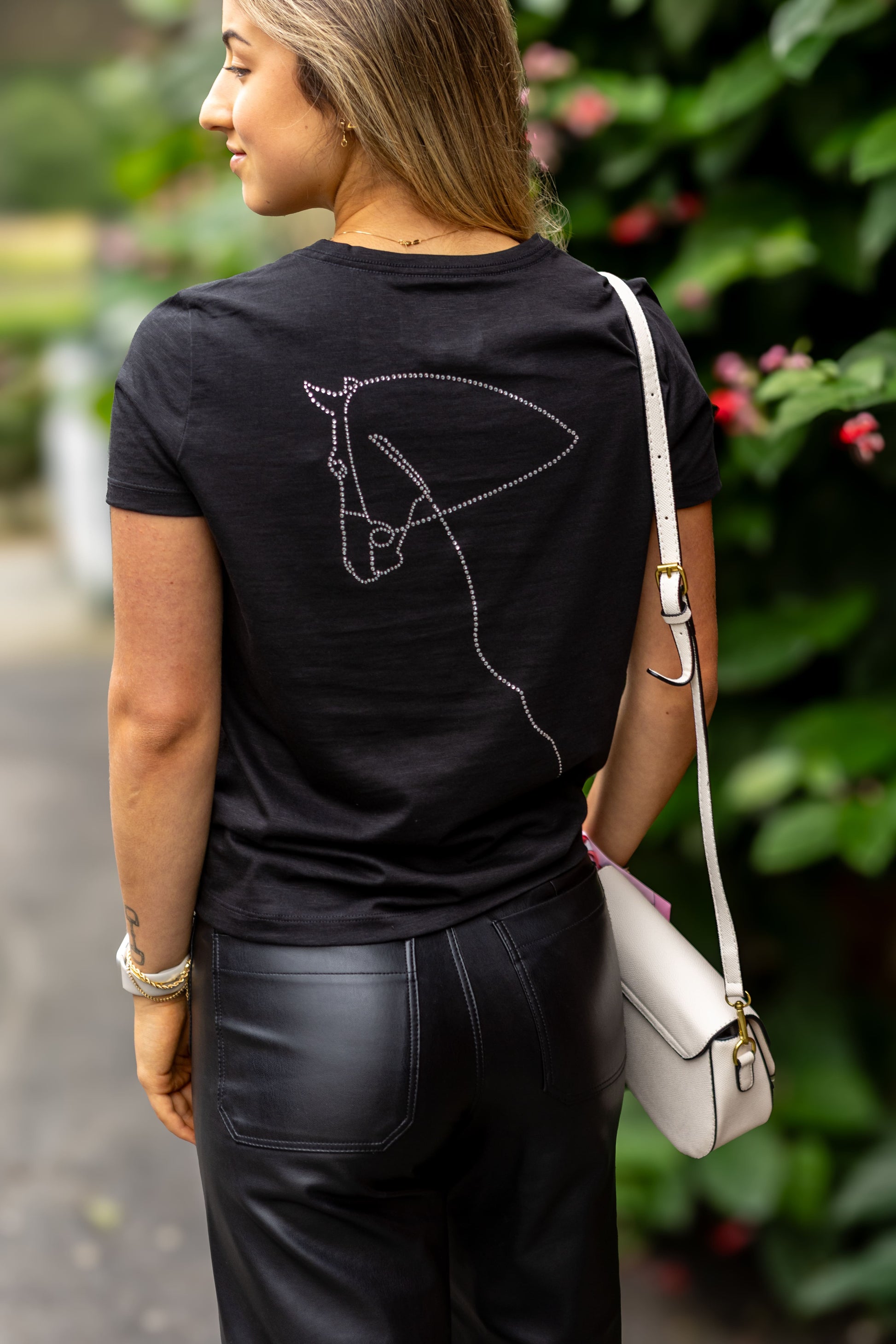 Elegância e atitude na parte de trás! Esta camiseta preta traz o desenho de um cavalo em contorno feito com aplicação de strass, dando um toque de brilho discreto e moderno.
