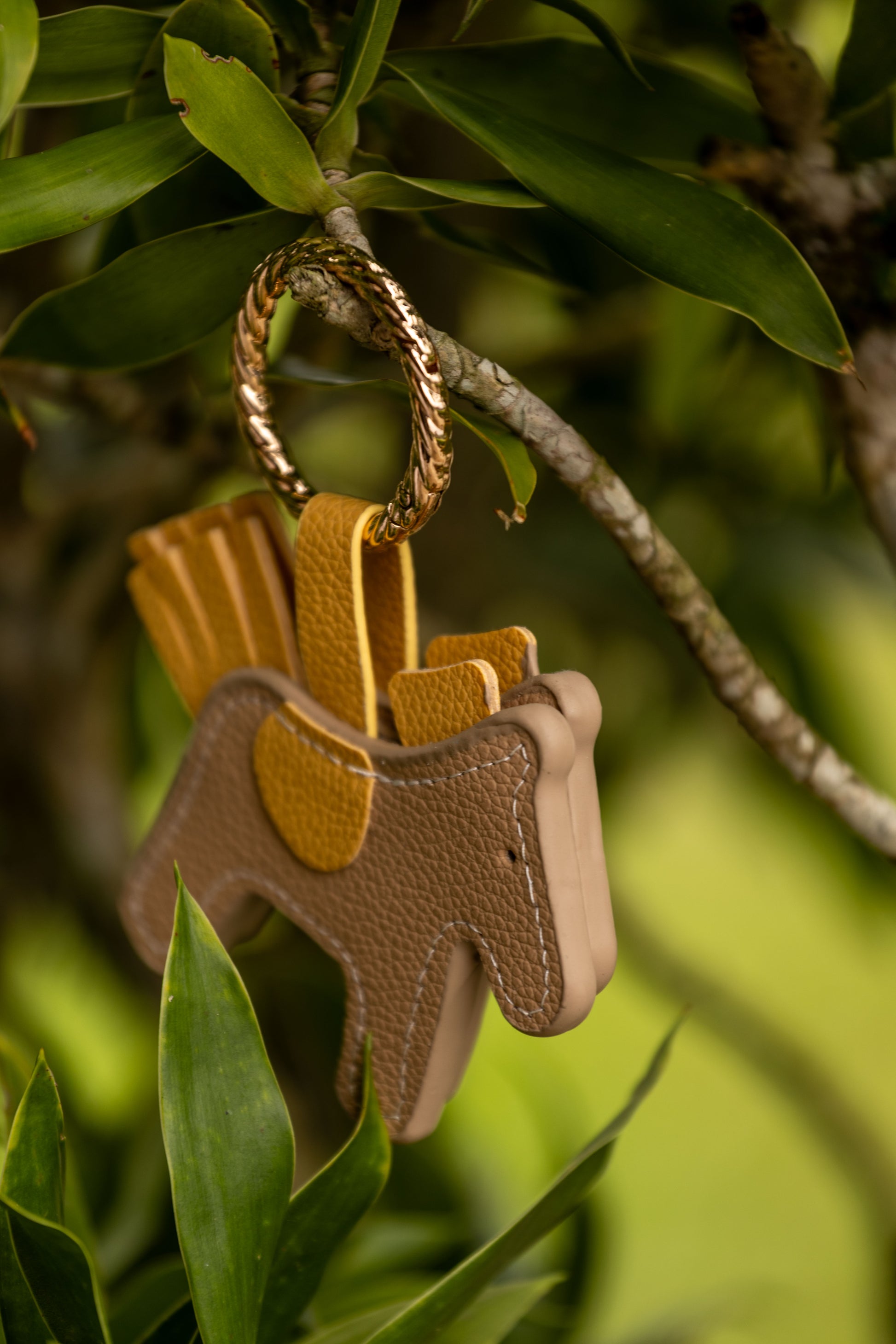 Estilo e atitude em couro equestre! ✨ Este chaveiro traz um design moderno de cavalinho em camadas de couro, unido a uma argola trançada dourada.