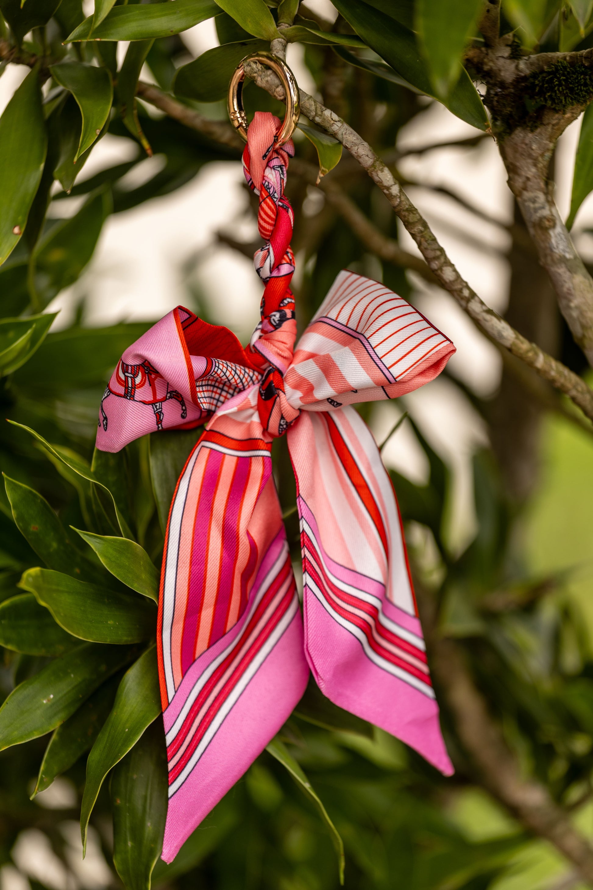 Estilo e atitude em um acessório elegante! 🎀 Este chaveiro traz uma argola dourada unida a um lindo lenço estampado, remetendo à sofisticação e ao charme equestre.