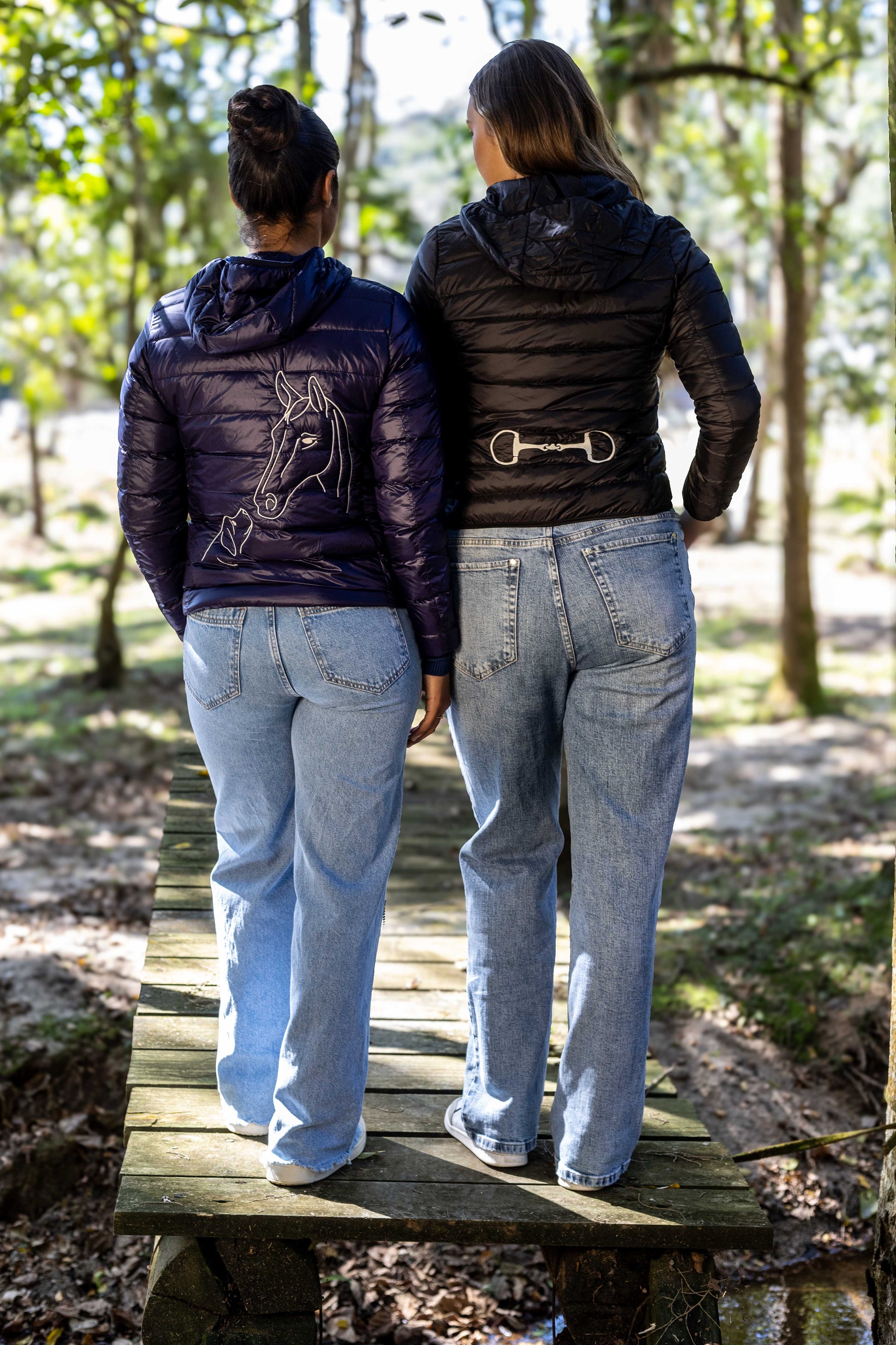 Estilo e atitude equestre para os dias frios, com destaque nas costas! ✨ Esta jaqueta preta traz o bordado moderno de um Bridão em destaque na parte traseira.