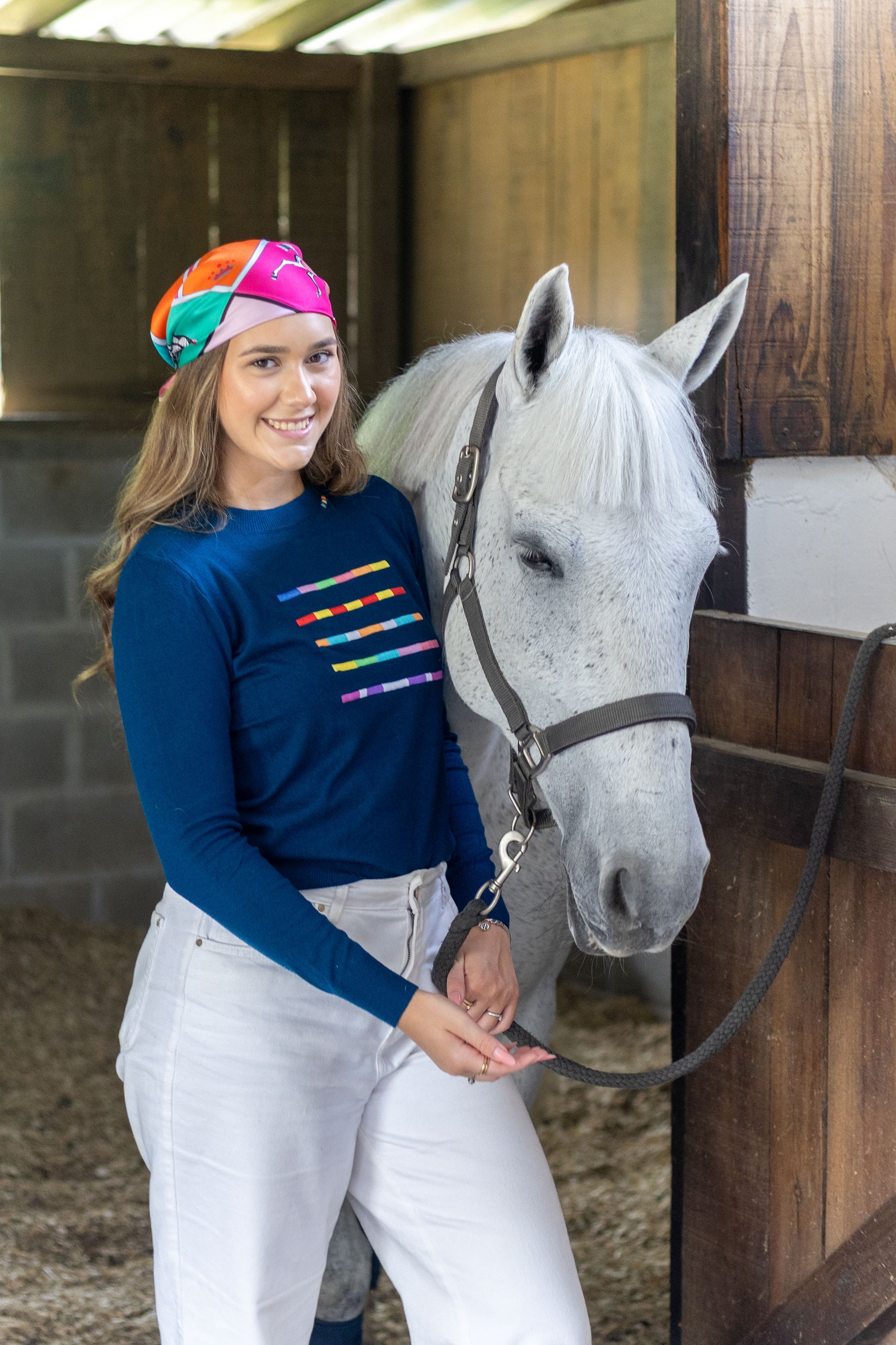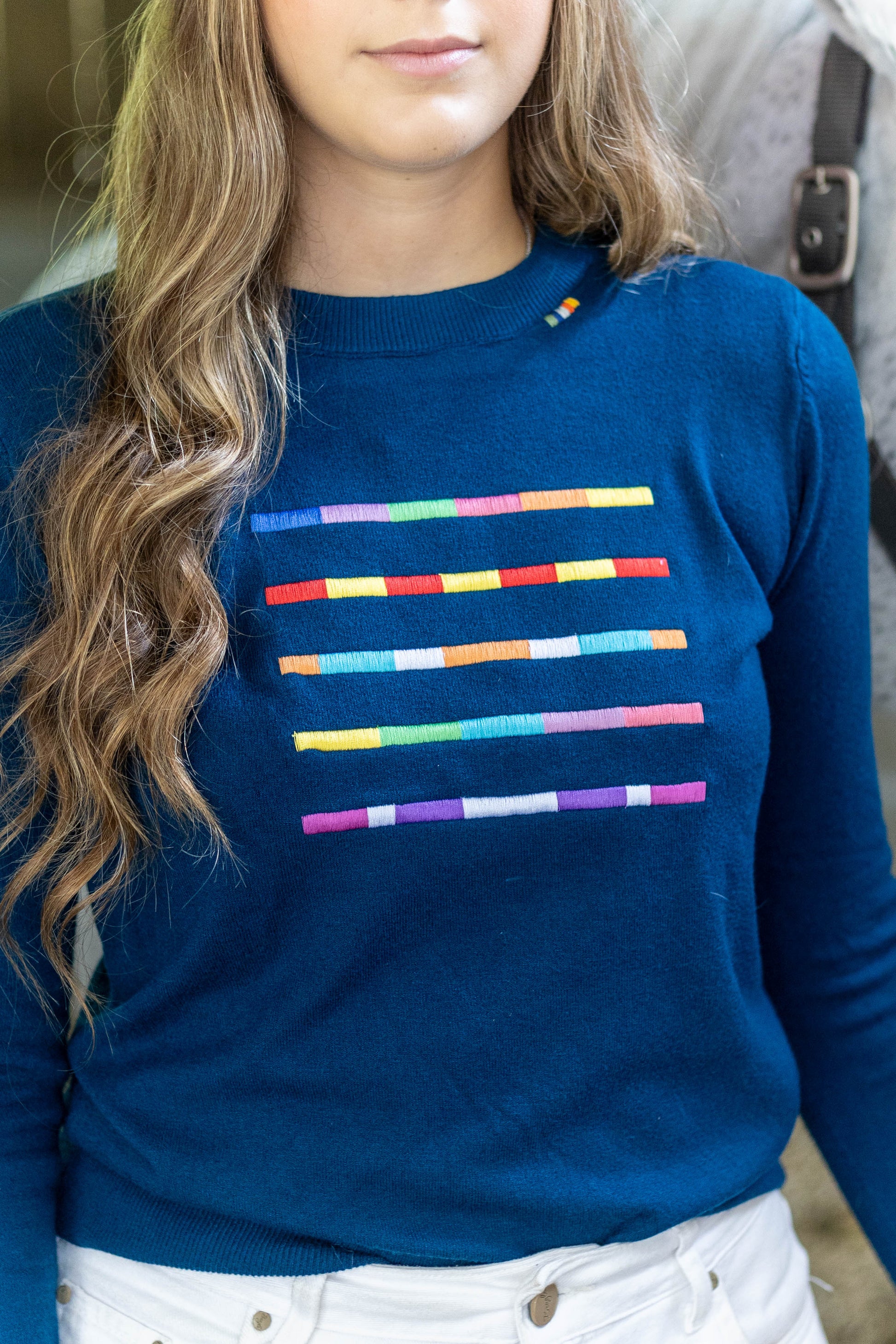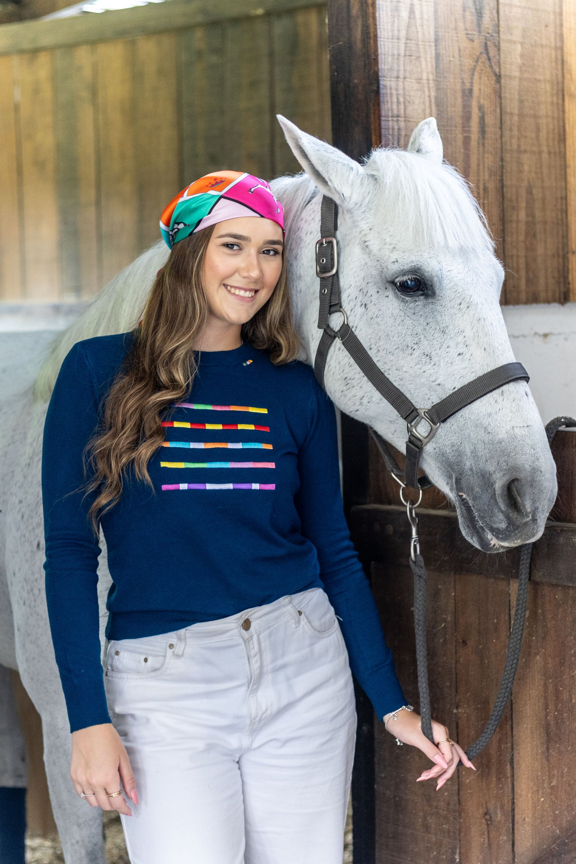 Toque de cor vibrante para o seu estilo! Este pullover azul-marinho é realçado por barras de salto bordadas em arco-íris, trazendo a paixão do hipismo com um design divertido e moderno. O tecido leve garante conforto e um caimento perfeito para todas as ocasiões.