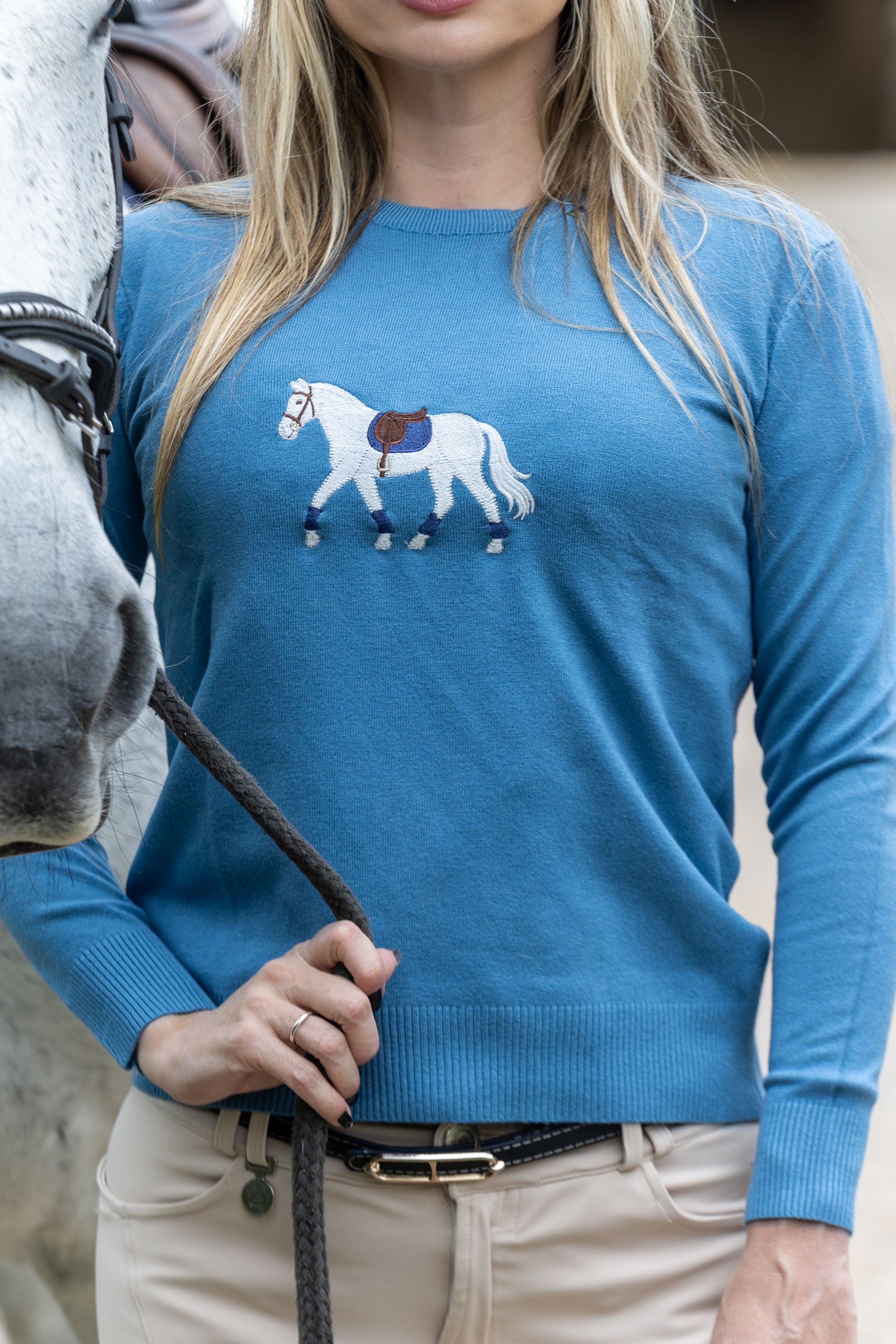 Elegância e conforto para quem ama a pureza da hípica! ✨ Este pullover azul traz o lindo bordado de um cavalo branco selado, unindo a sofisticação da cor com a sua paixão equestre.
