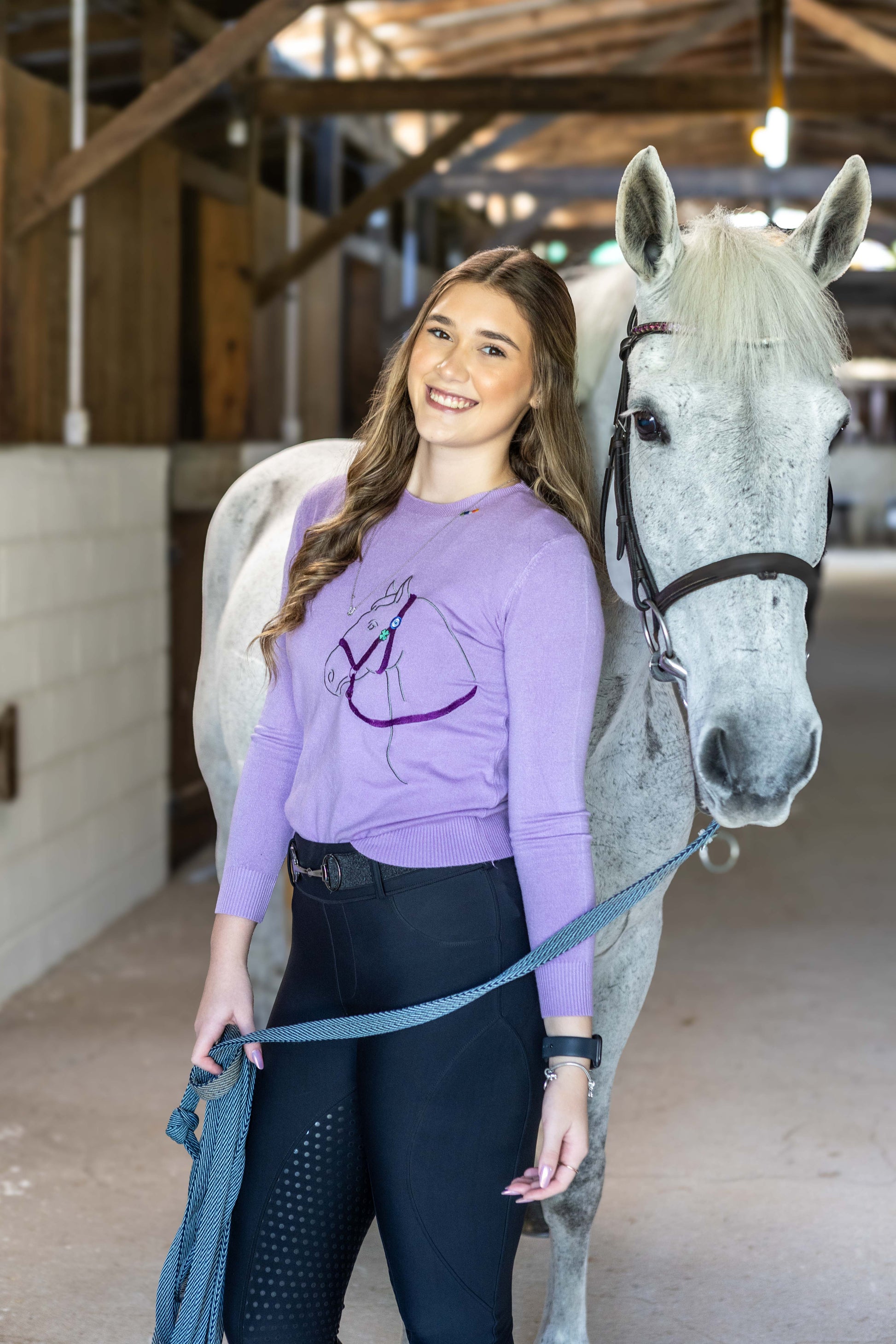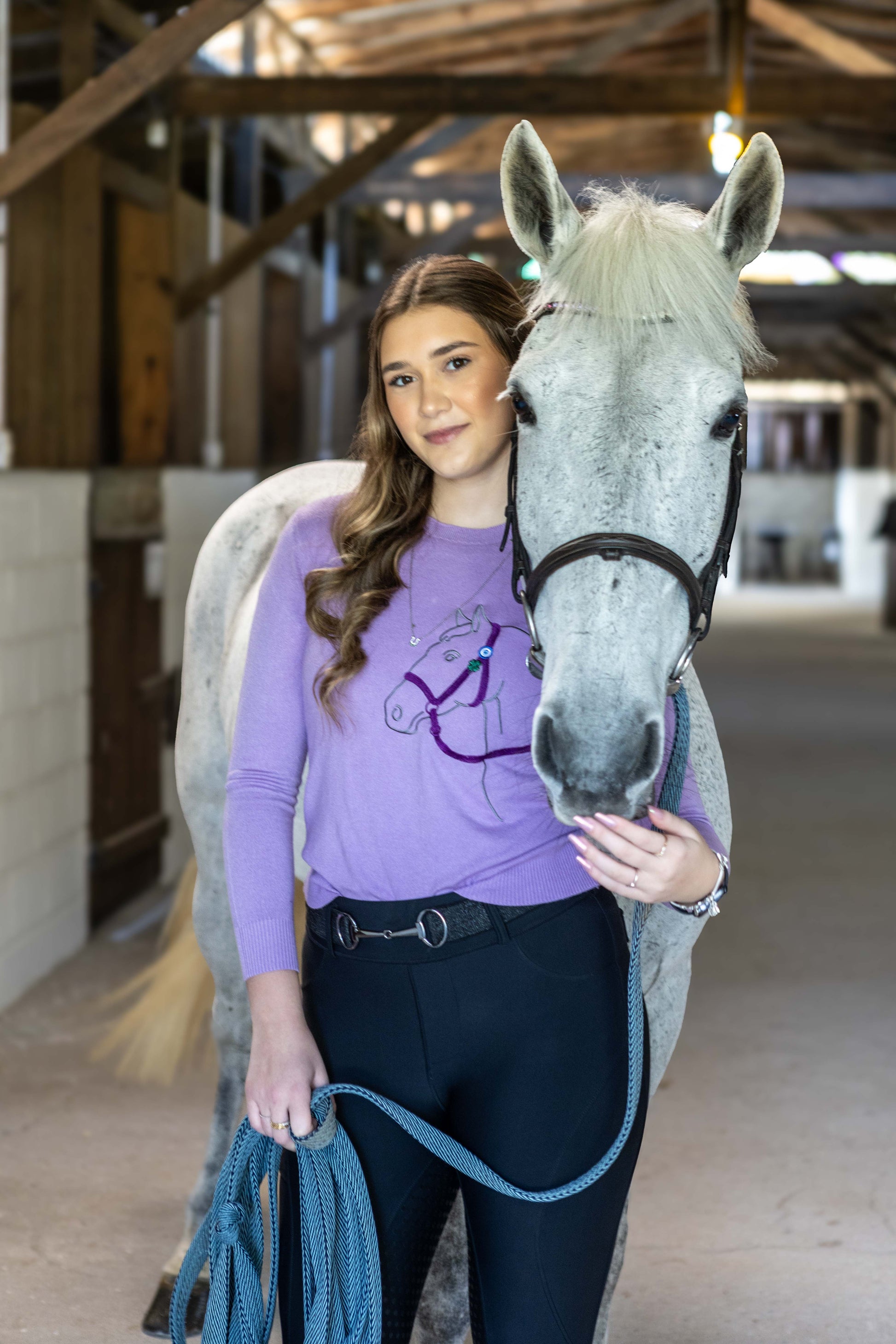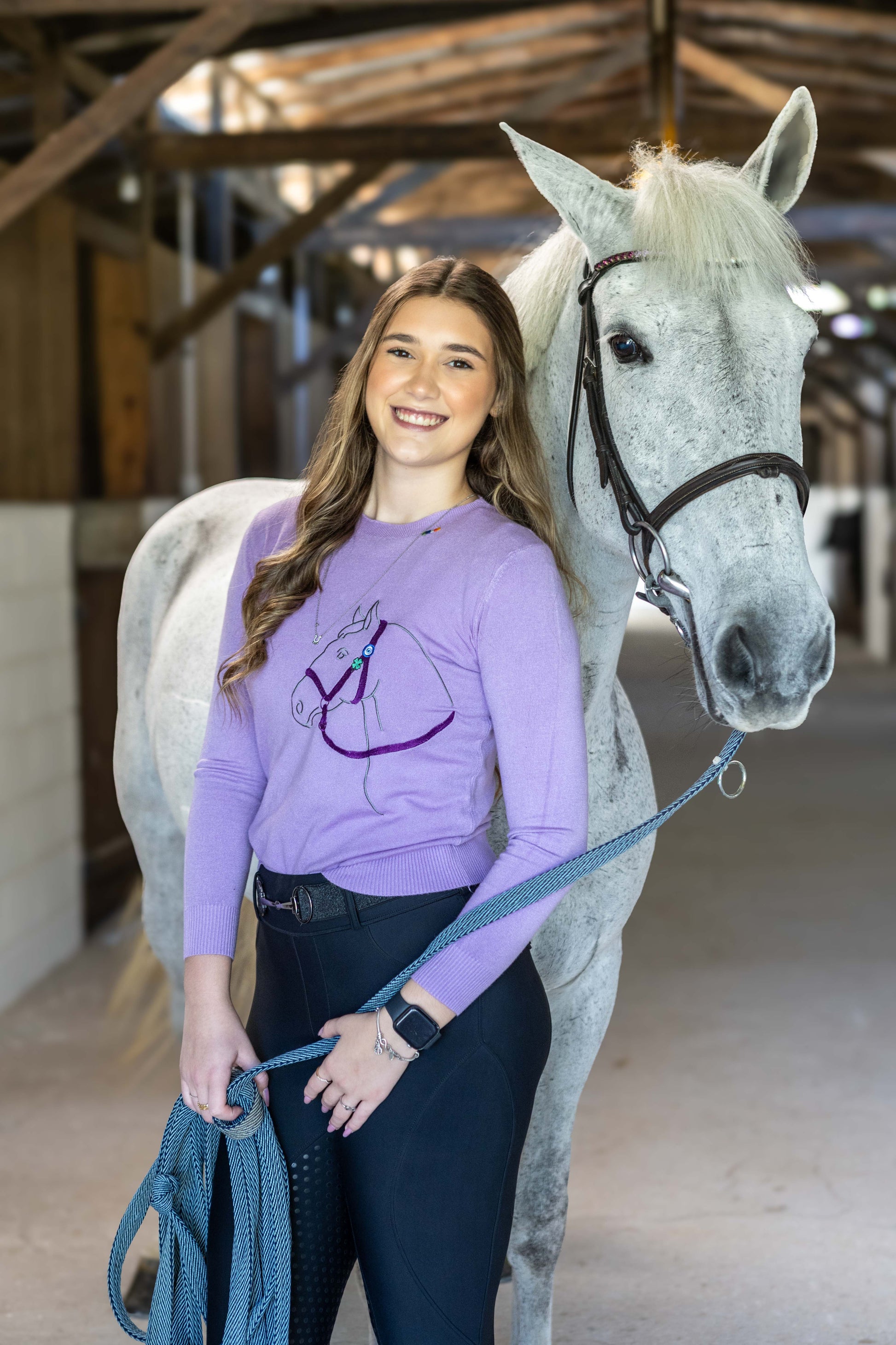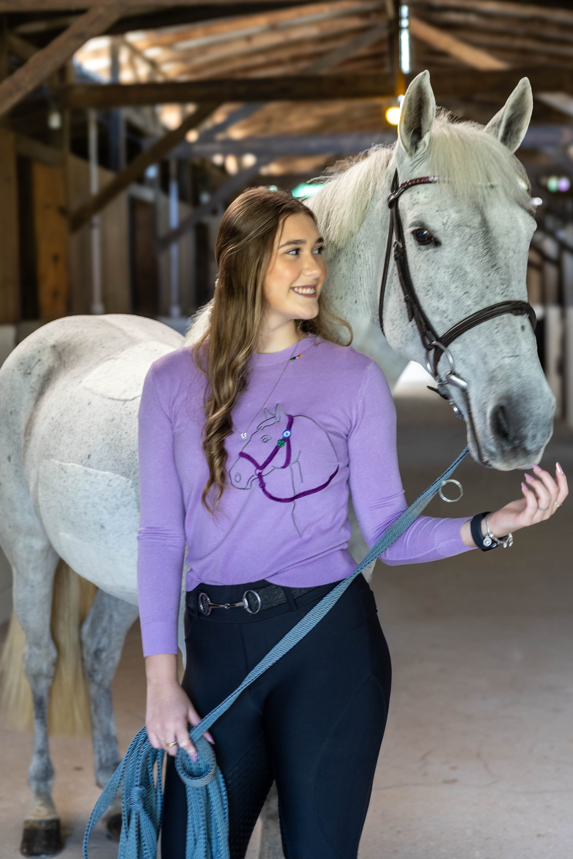Elegância e paixão equestre em uma peça! Este pullover lilás suave apresenta um delicado bordado de um cavalo de perfil e um estribo. Feito para quem carrega o amor pelos cavalos no estilo. Conforto perfeito para o seu dia a dia.