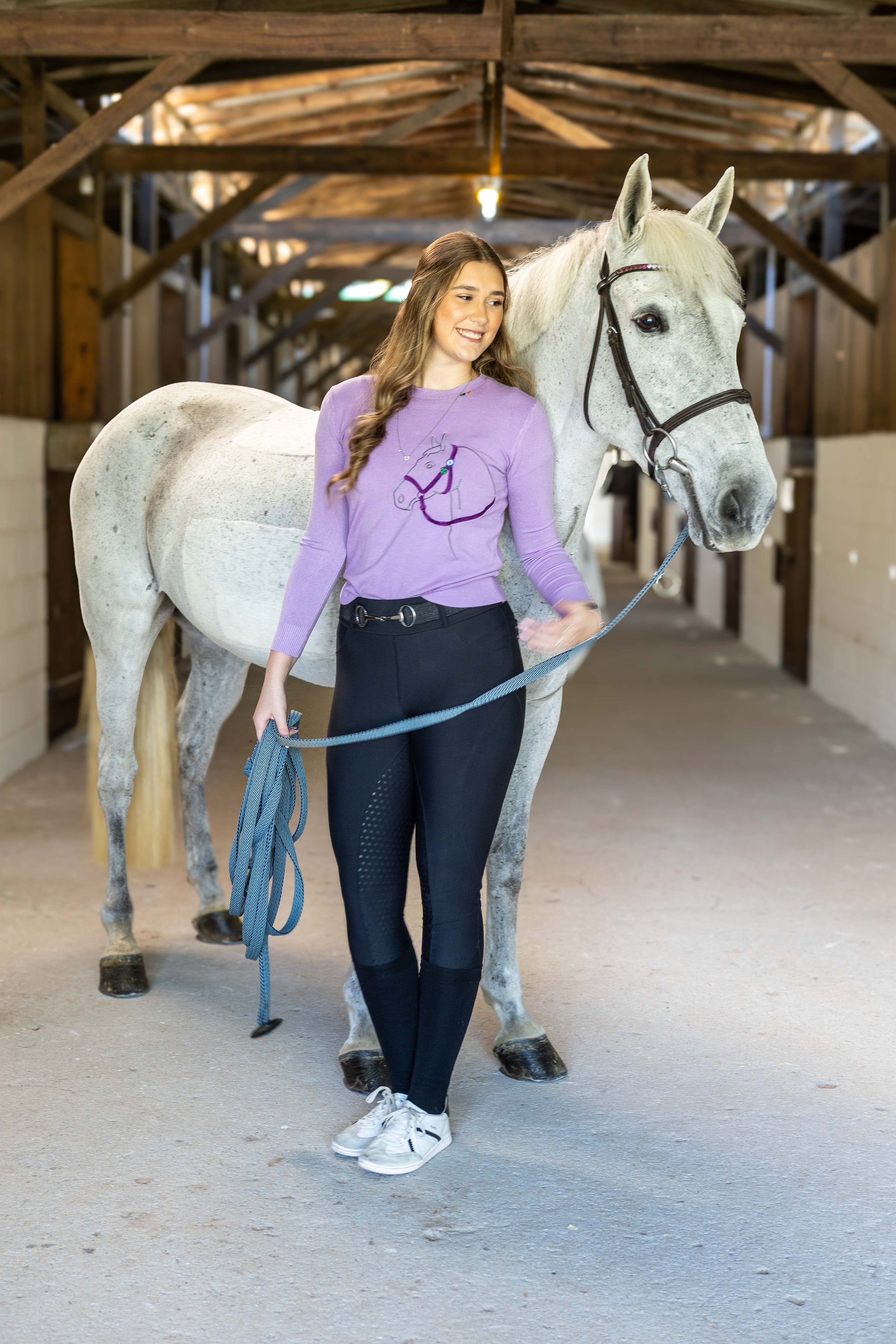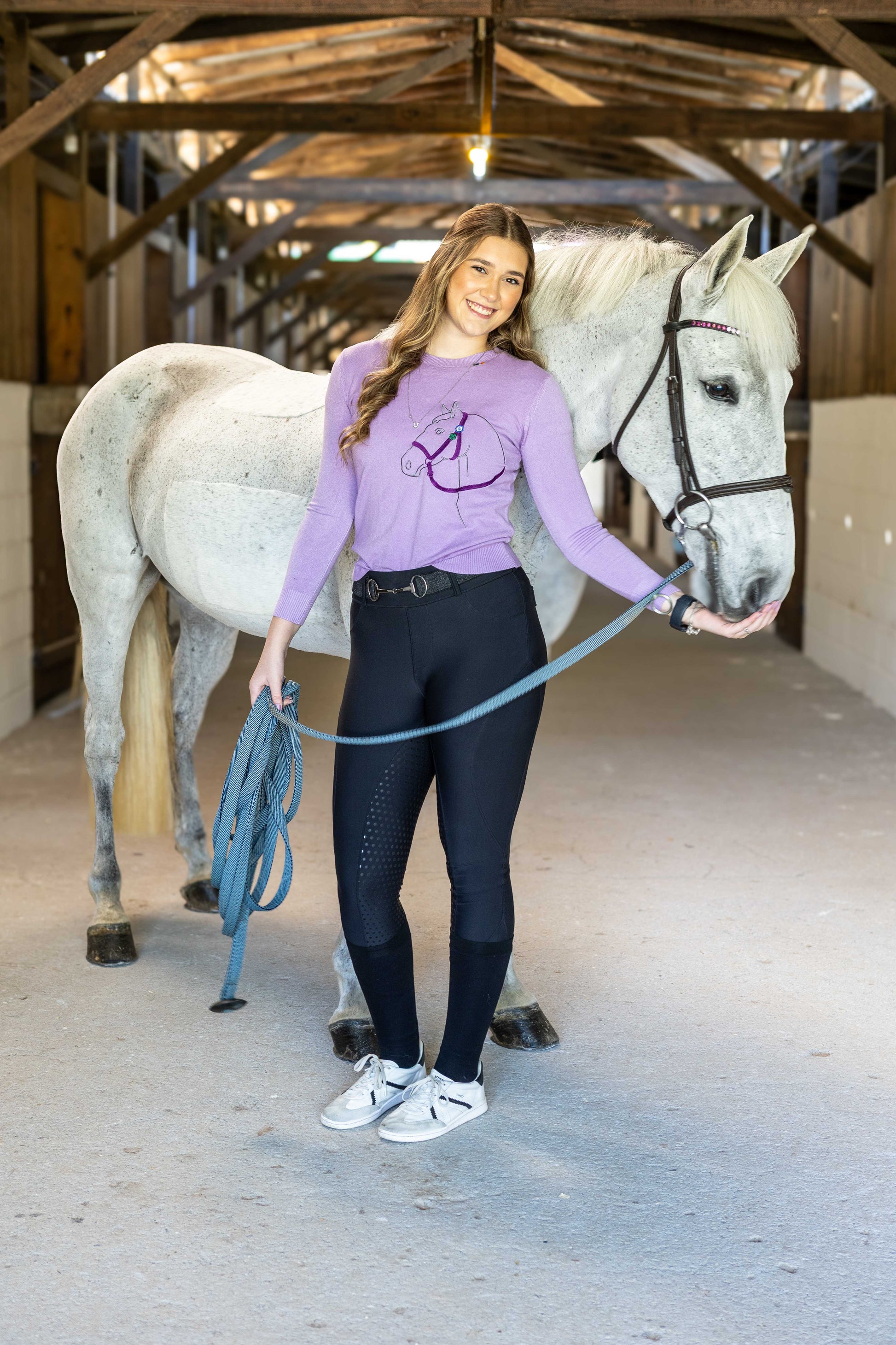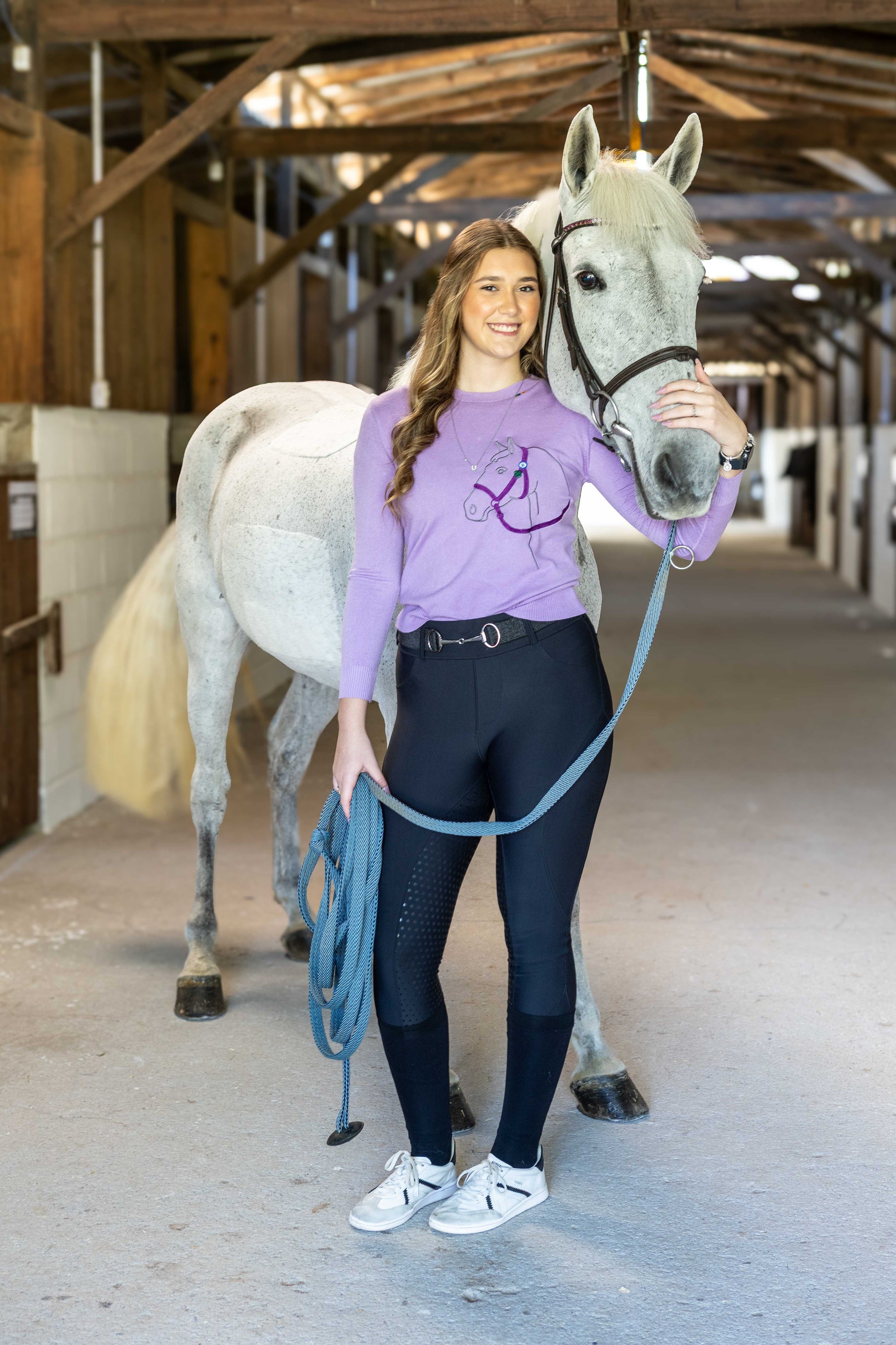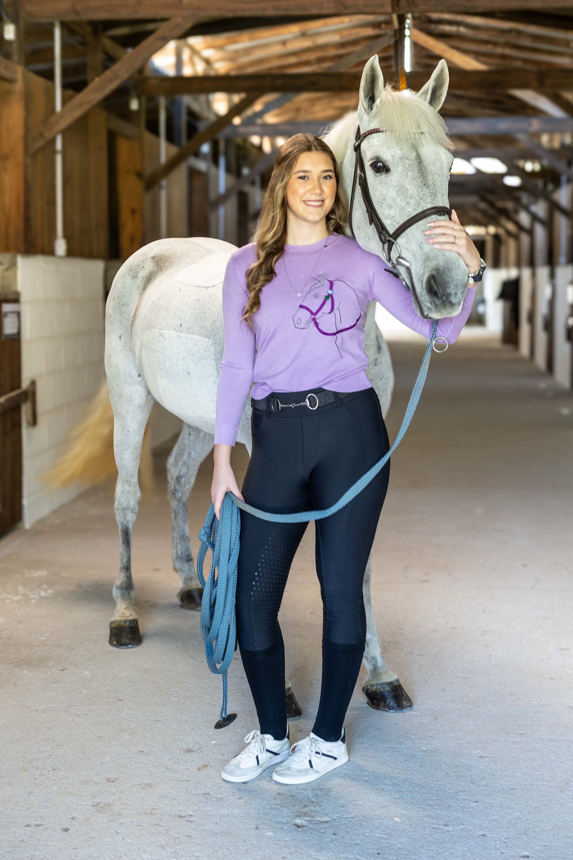 Elegância e paixão equestre em uma peça! Este pullover lilás suave apresenta um delicado bordado de um cavalo de perfil e um estribo. Feito para quem carrega o amor pelos cavalos no estilo. Conforto perfeito para o seu dia a dia.