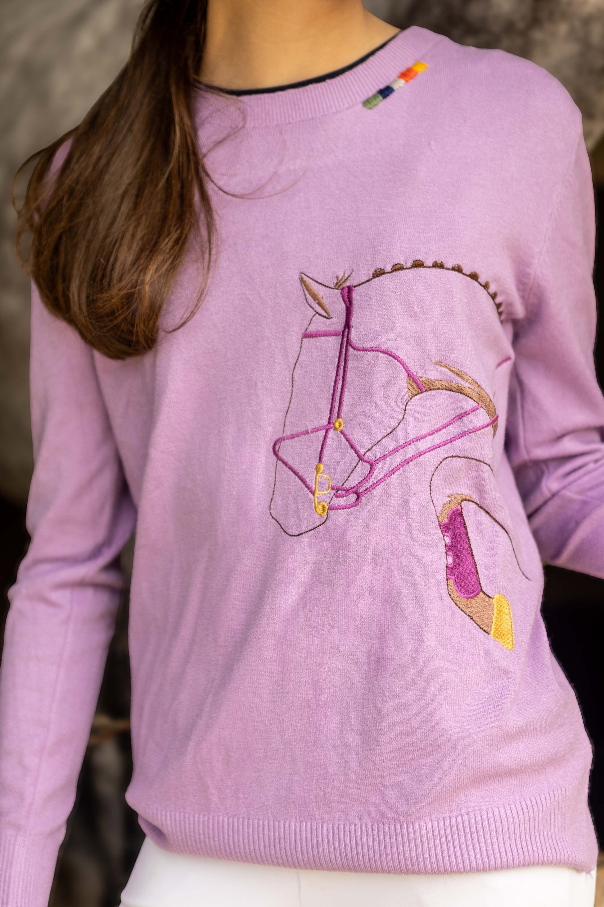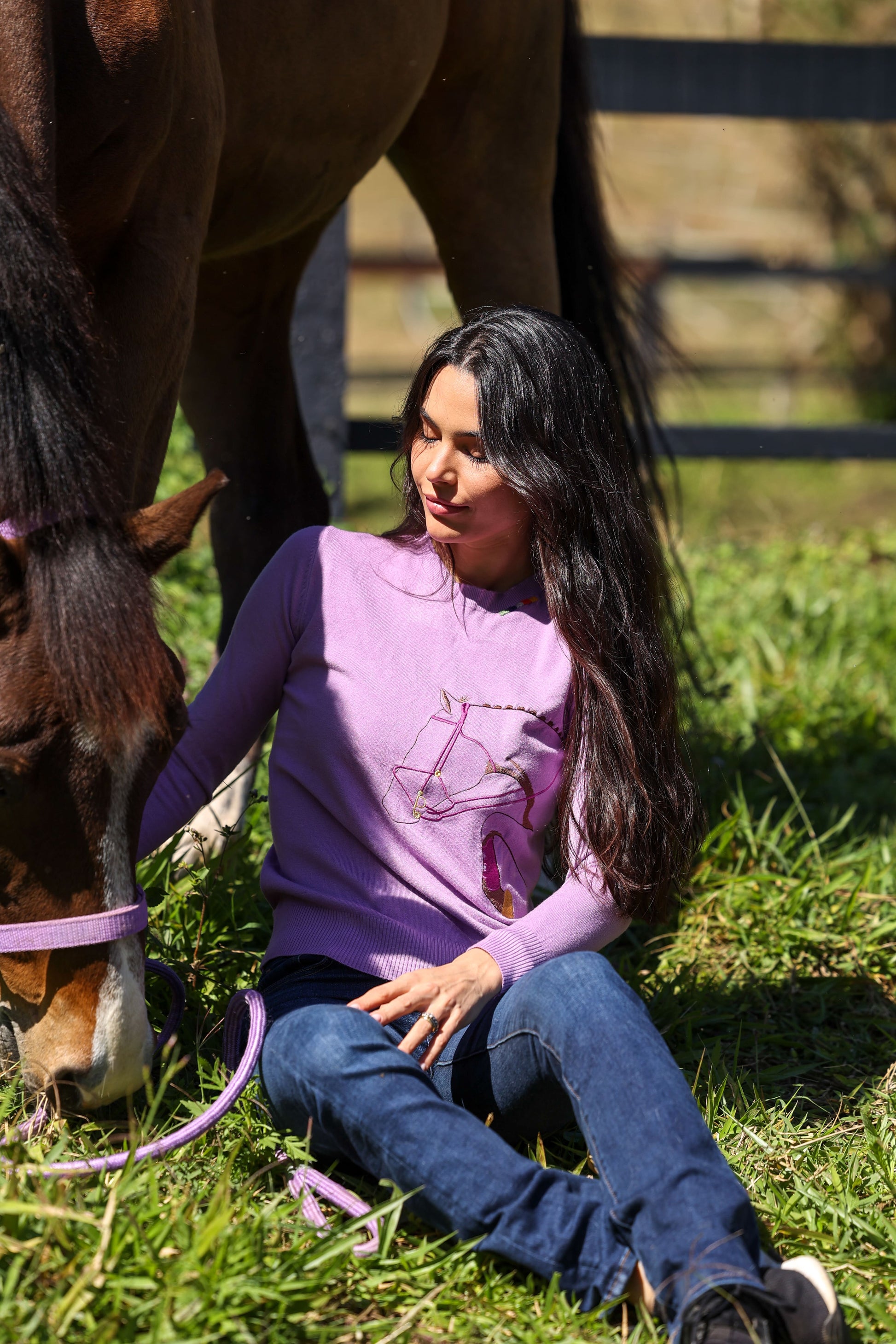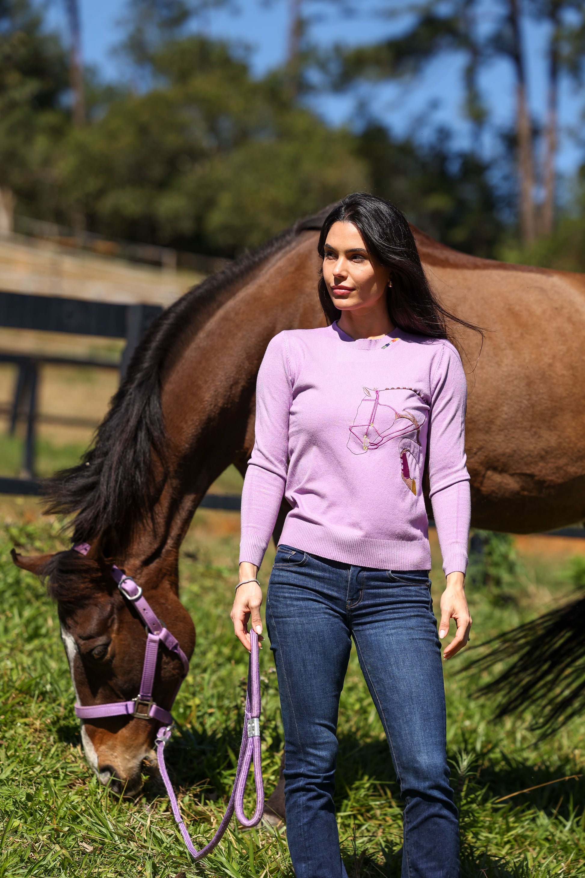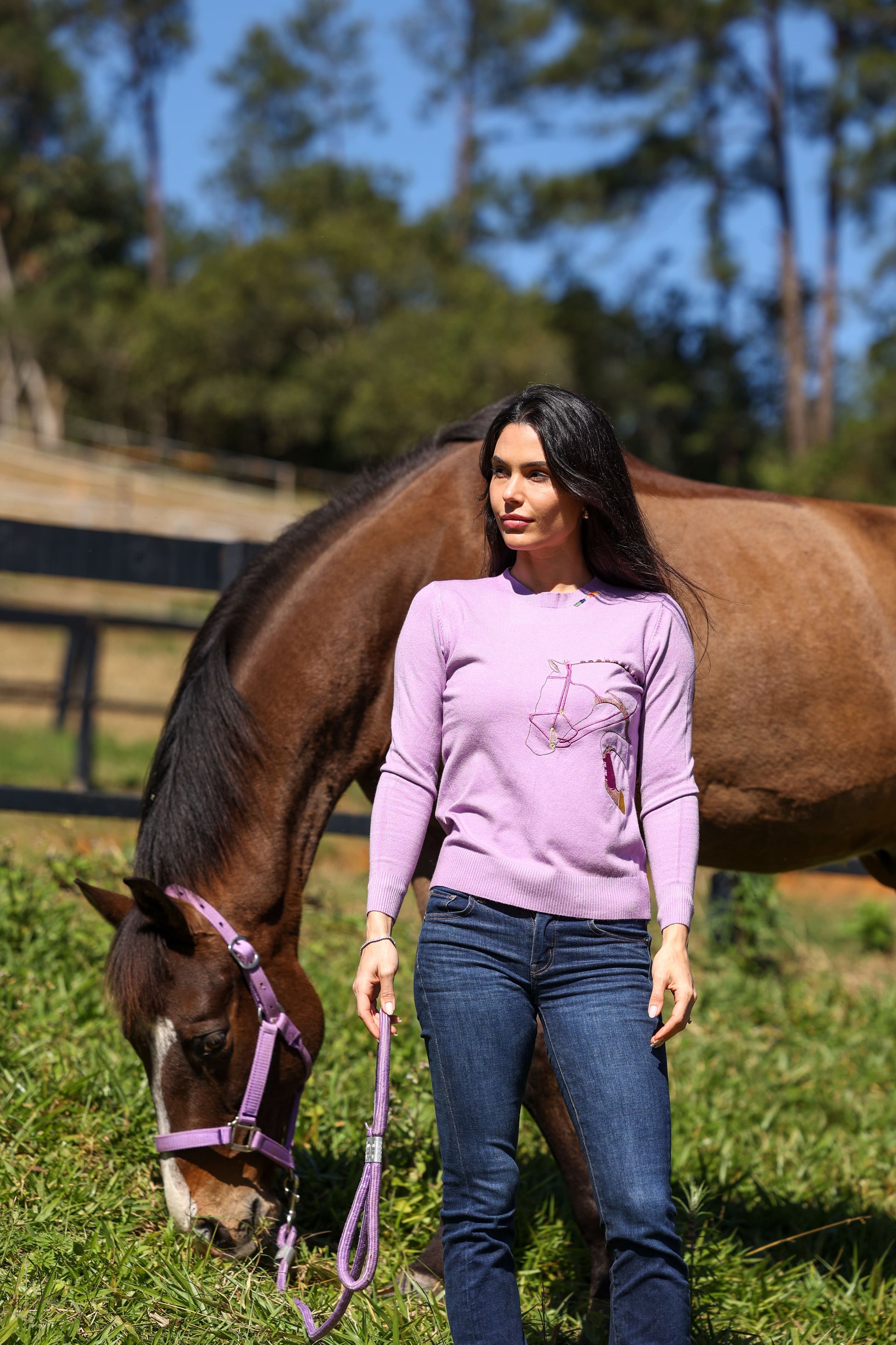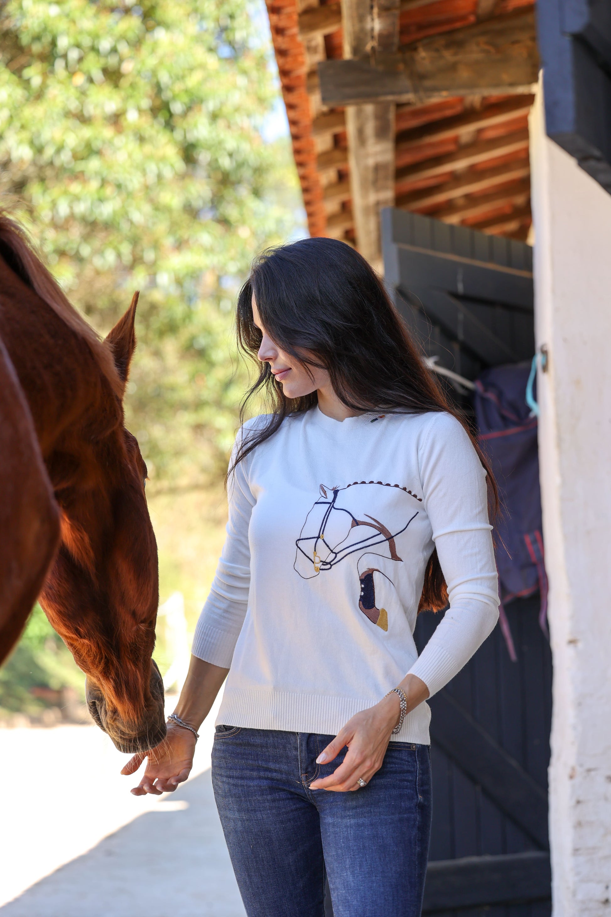 Elegância clássica com toque equestre! Este pullover branco puro apresenta um bordado sofisticado de um cavalo de rédeas e um estribo. É a peça ideal para quem deseja um visual refinado e atemporal, combinando a paixão pelos cavalos com a versatilidade.