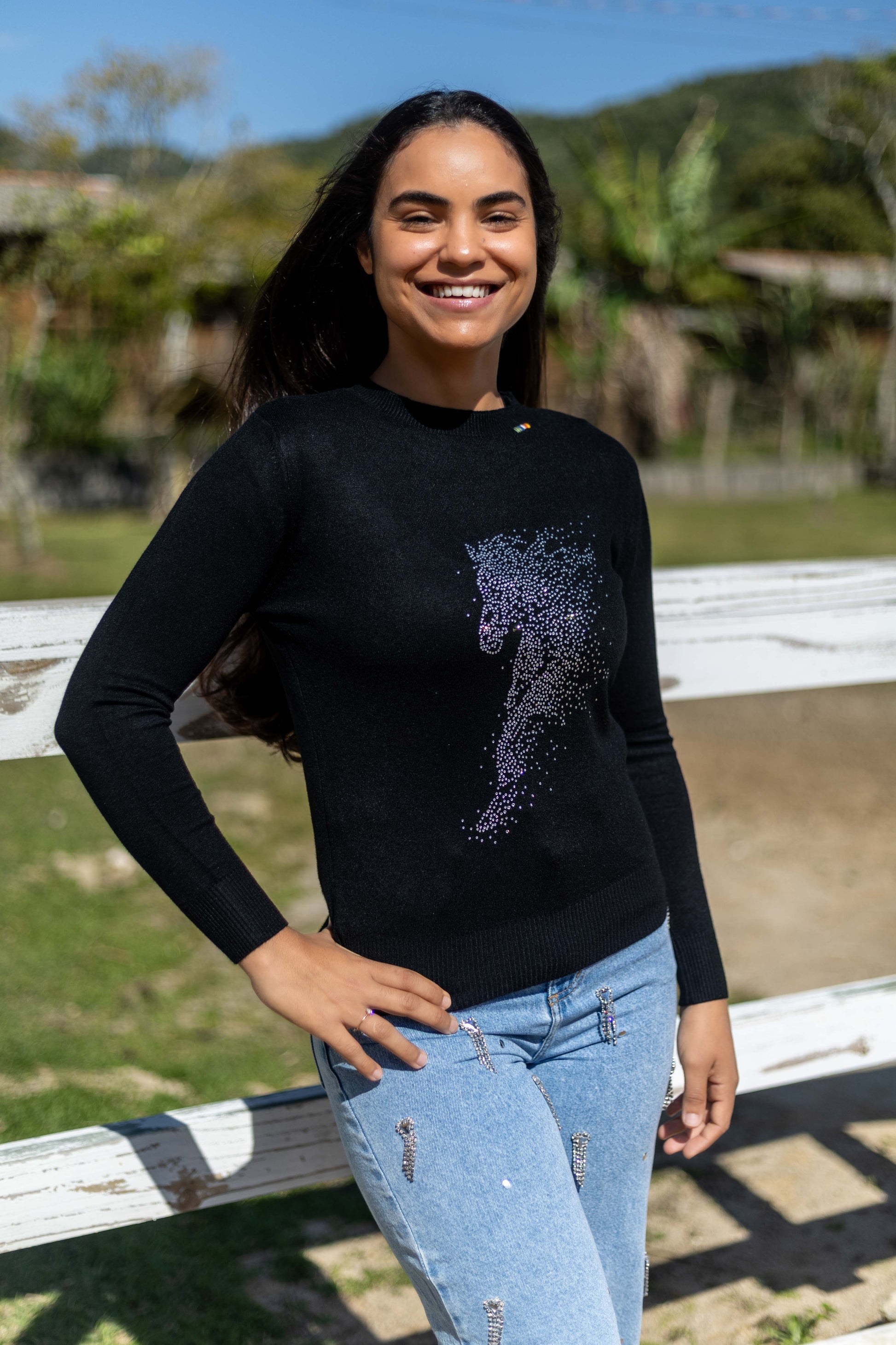 Estilo e brilho em um pullover que celebra a liberdade! ✨ Este pullover preto traz o desenho de um cavalo em movimento feito com milhares de delicados strass brilhantes, criando um efeito esvoaçante e mágico.