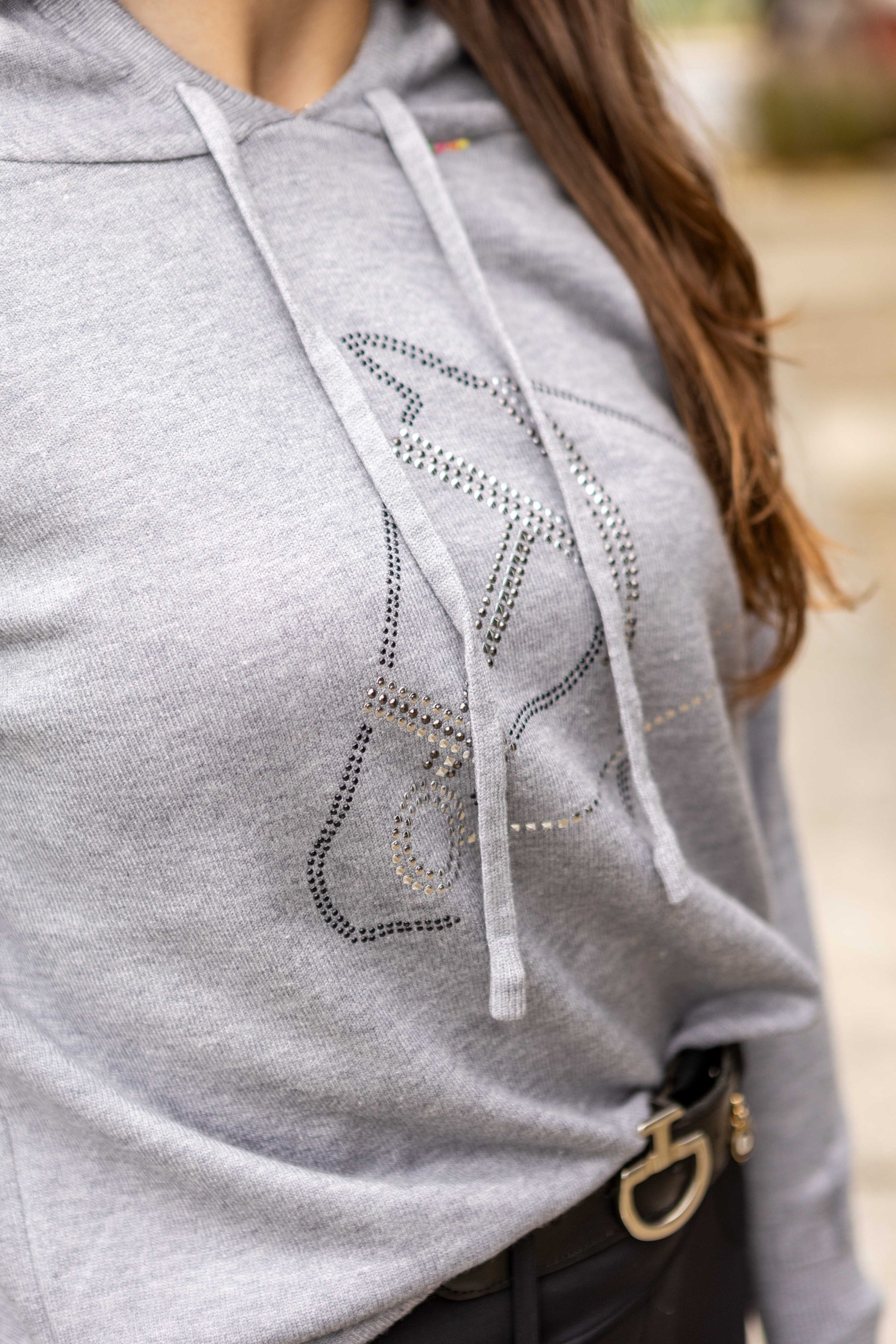 Conforto casual e toque de brilho equestre! Este pullover cinza com capuz apresenta um detalhe em strass que forma a silhueta de um bridão com as rédeas. Uma peça que une o estilo despojado do moletom com a paixão sofisticada pelo hipismo, adicionando um ponto de luz ao seu visual.