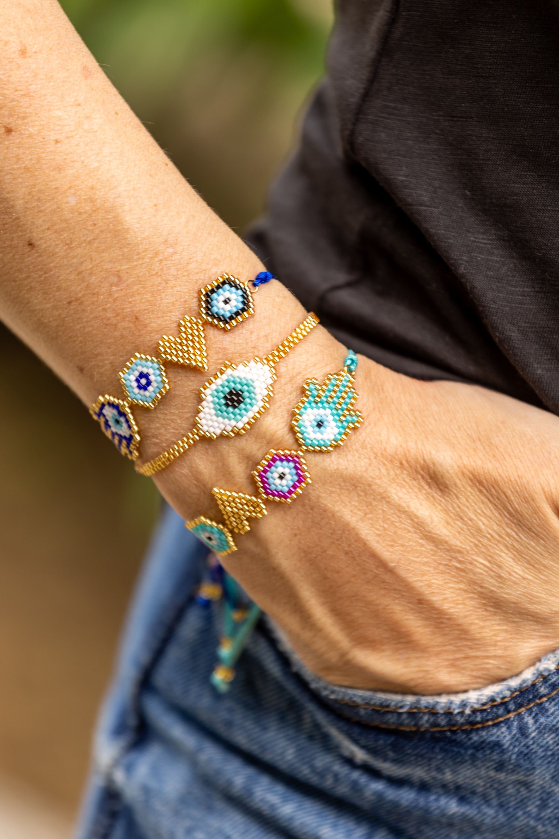 Estilo, cor e proteção para o seu pulso! ✨ Estas pulseiras artesanais são feitas com miçangas delicadas e coloridas, combinando tons dourados, azuis e turquesa.