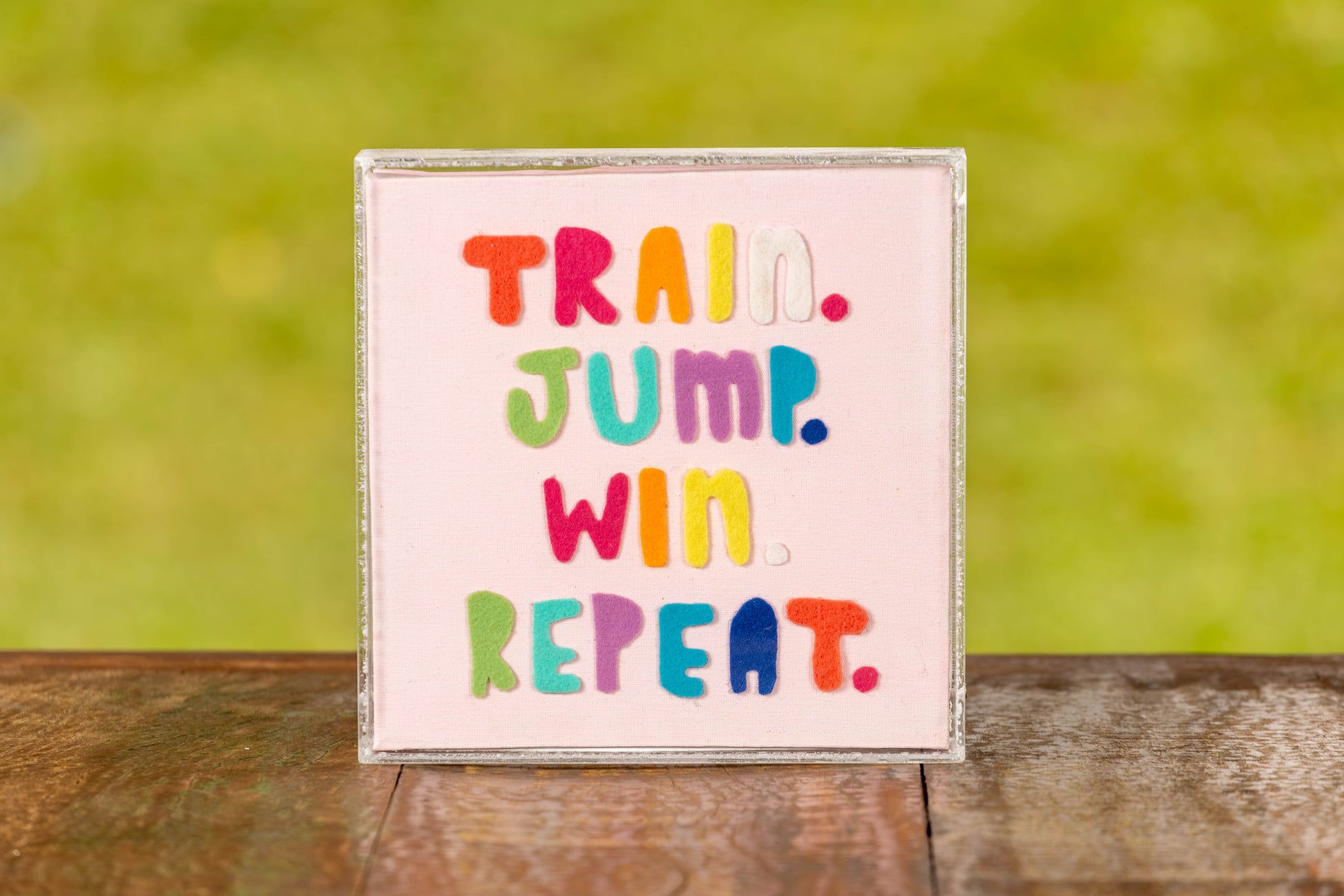 A filosofia do esporte em cores vibrantes! Este quadro apresenta a frase motivacional "TRAIN. JUMP. WIN. REPEAT." com letras coloridas e em alto-relevo. É a peça perfeita para inspirar e energizar seu ambiente, celebrando a dedicação e a paixão pelo hipismo.