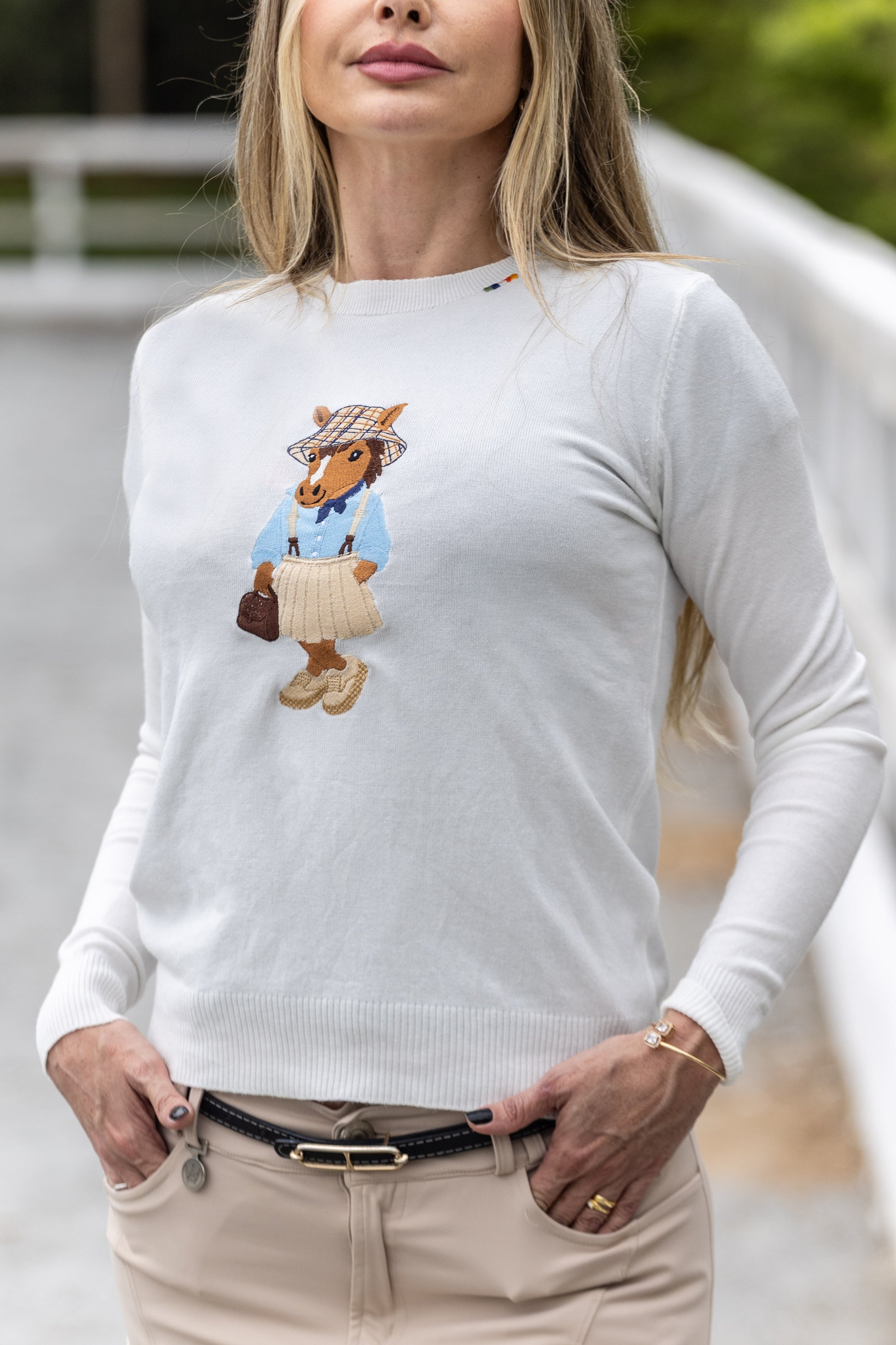 O estilo preppy encontra a paixão equestre! Este suéter branco apresenta um bordado exclusivo e divertido de um cavalo vestido com saia plissada, suspensórios e chapéu. Uma peça com identidade college e atitude chic, perfeita para um visual elegante e descontraído.