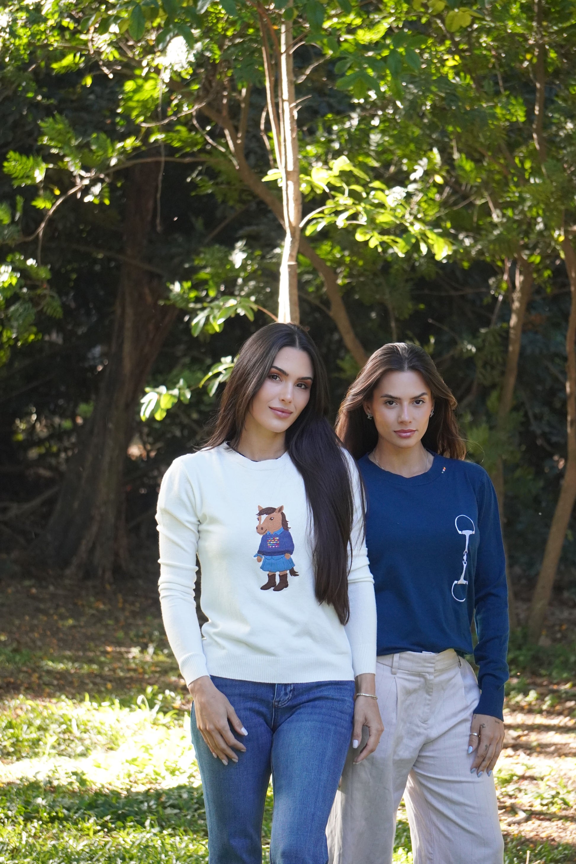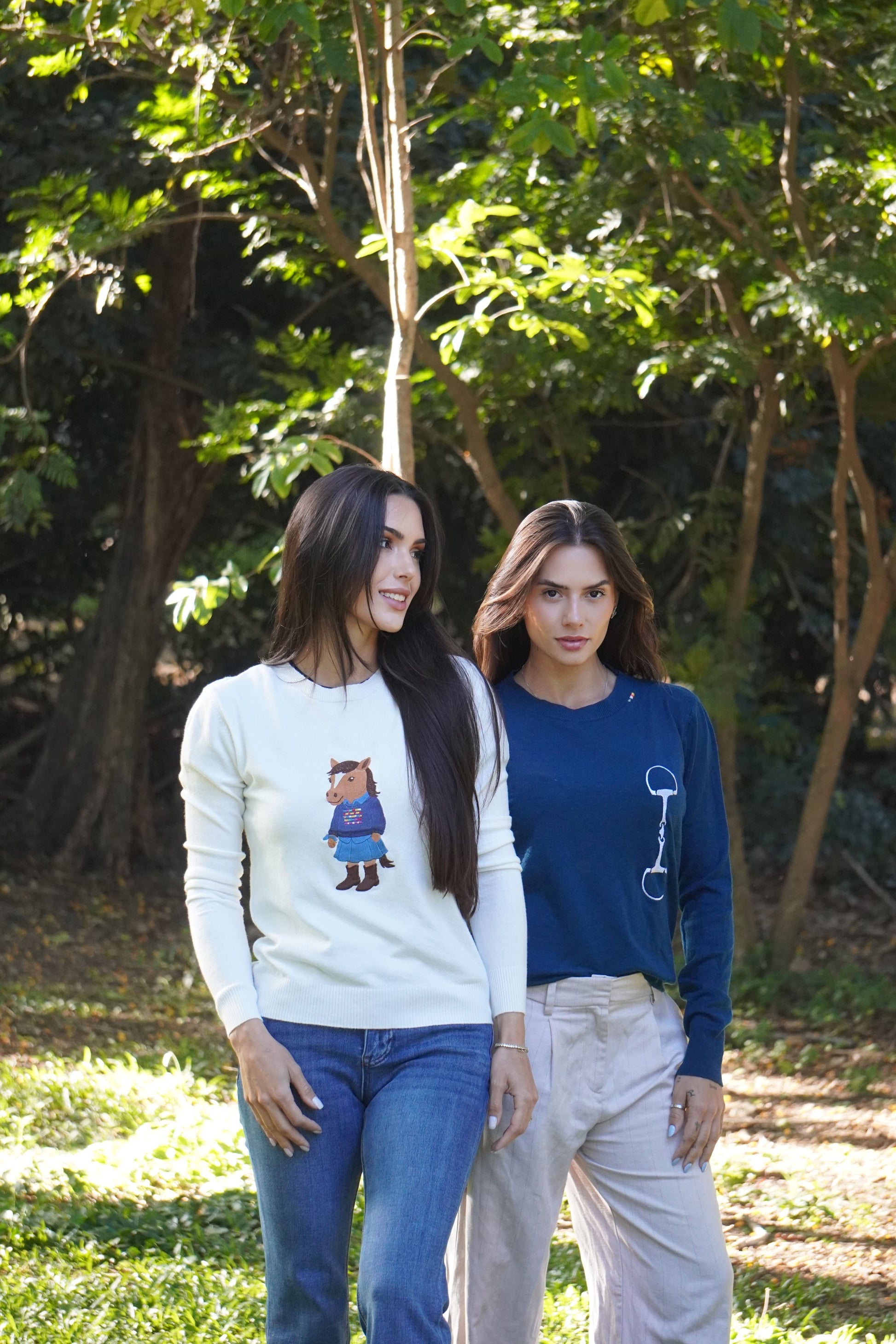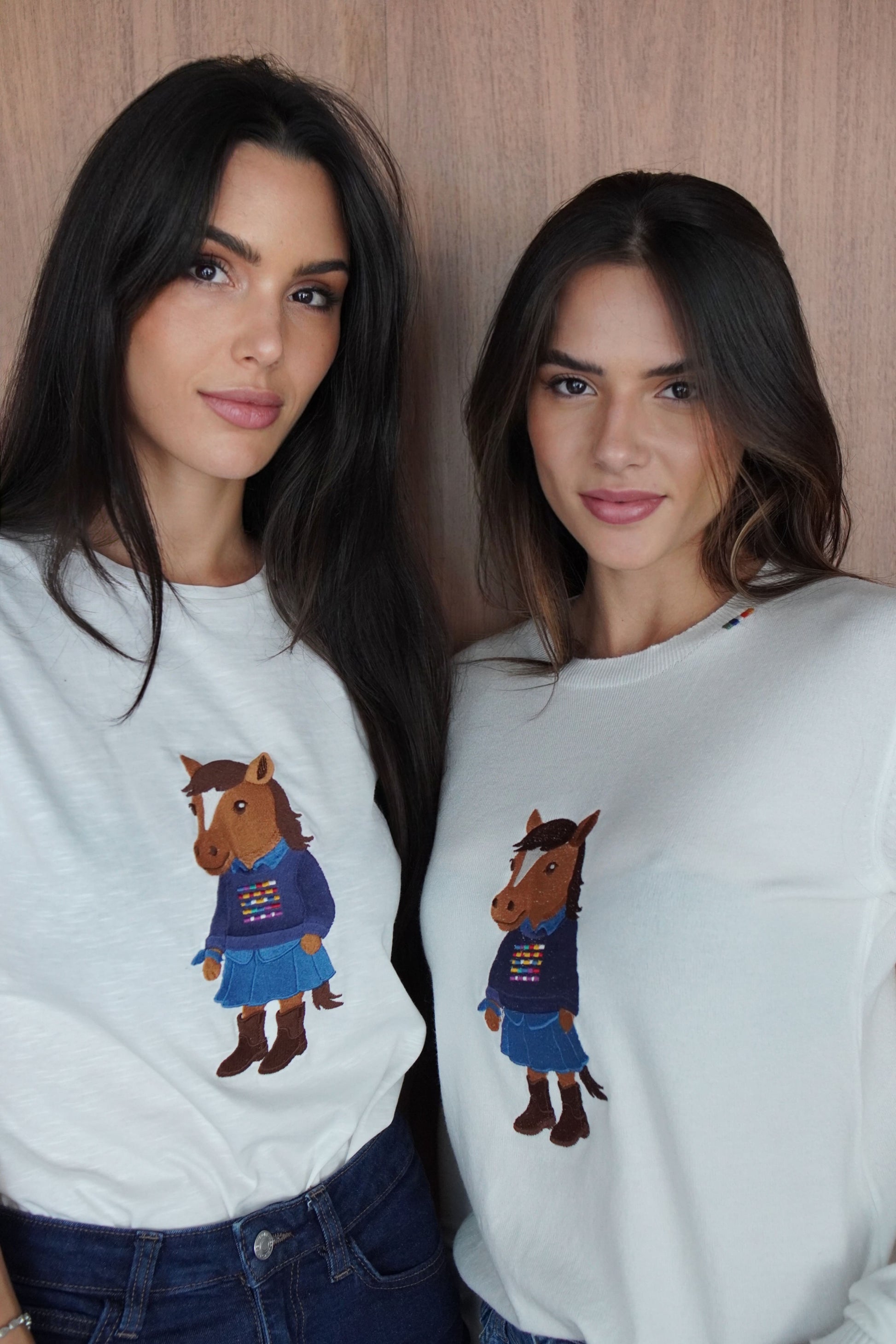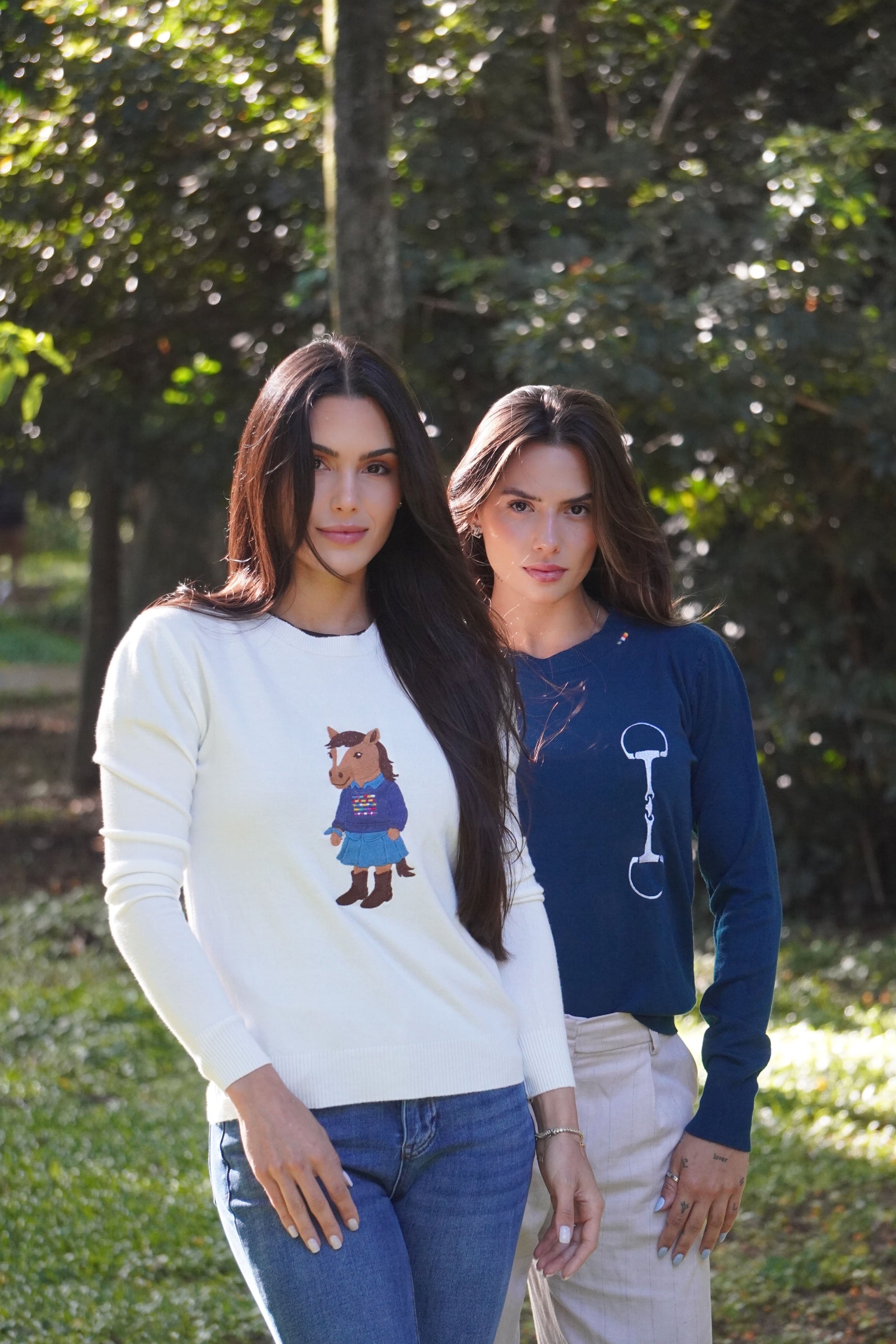O charme rústico encontra o estilo hípico! Este suéter branco apresenta um bordado exclusivo e divertido de um cavalo vestido com um casaco xadrez, chapéu e botas. Uma peça com identidade country e atitude fashion, perfeita para quem ama cavalos com elegância.