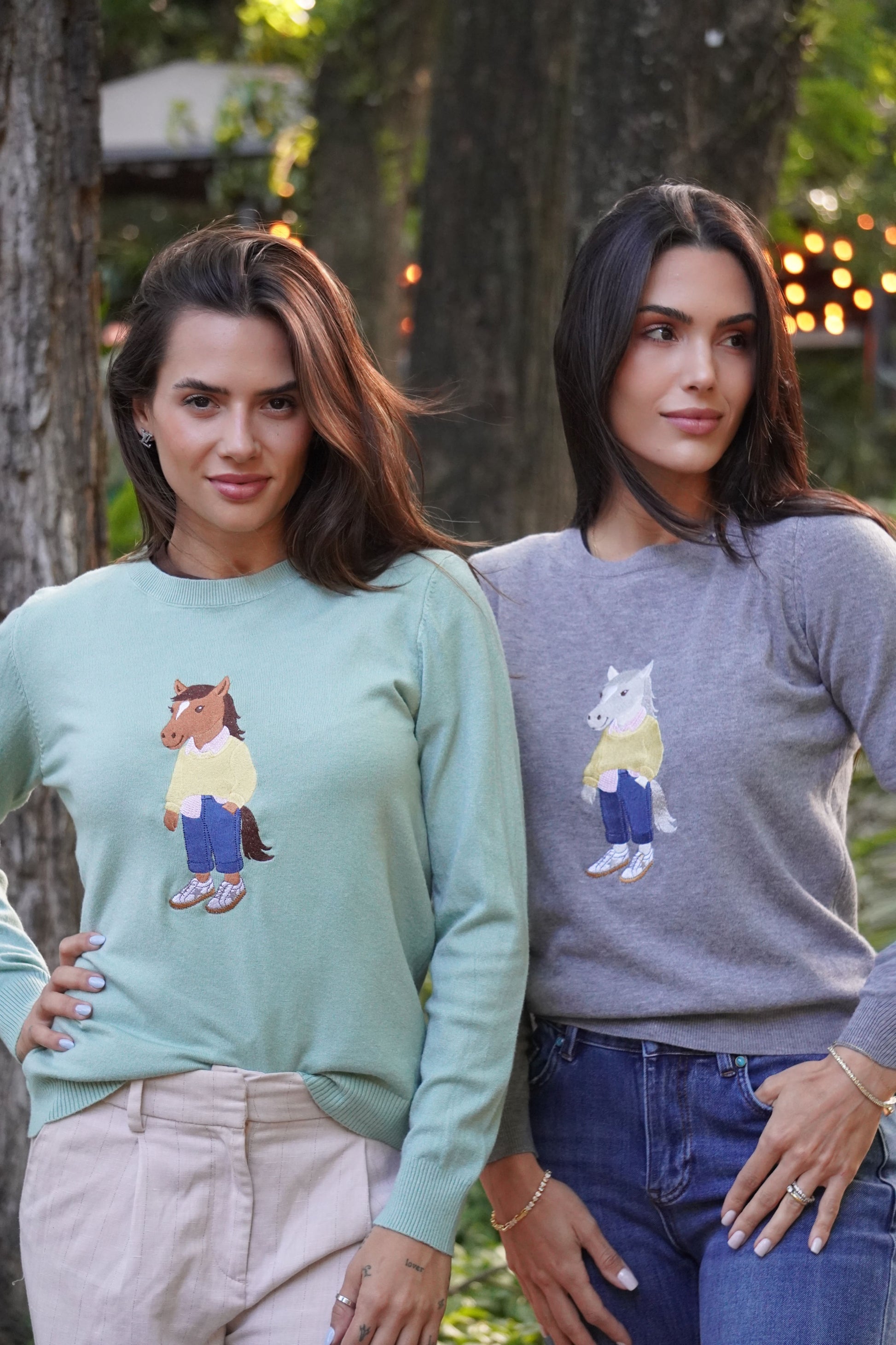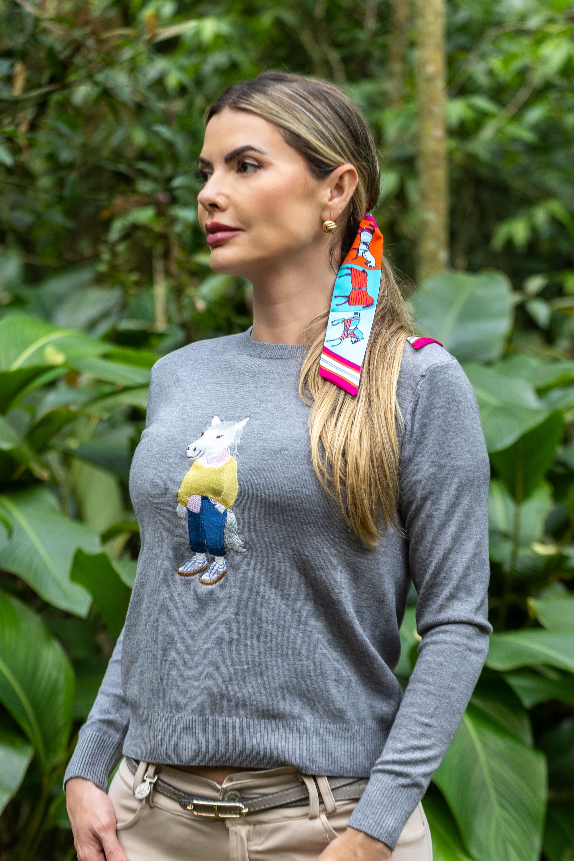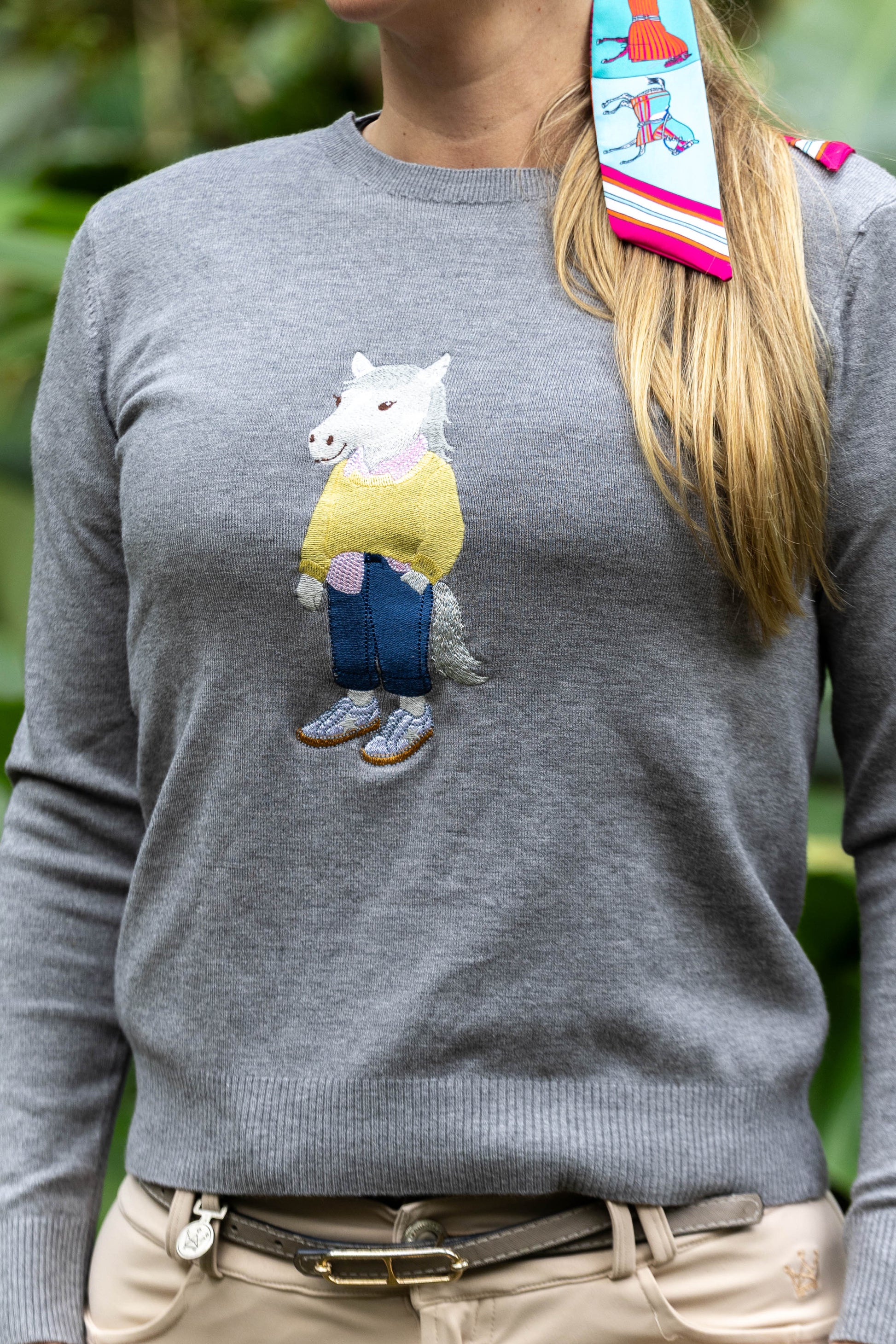 Conforto casual com toque hípico divertido! Este suéter cinza mescla apresenta um bordado exclusivo e divertido de um cavalo vestido com um casaco amarelo, jeans e tênis. Uma peça com identidade despojada e atitude fashion, perfeita para o seu dia a dia.